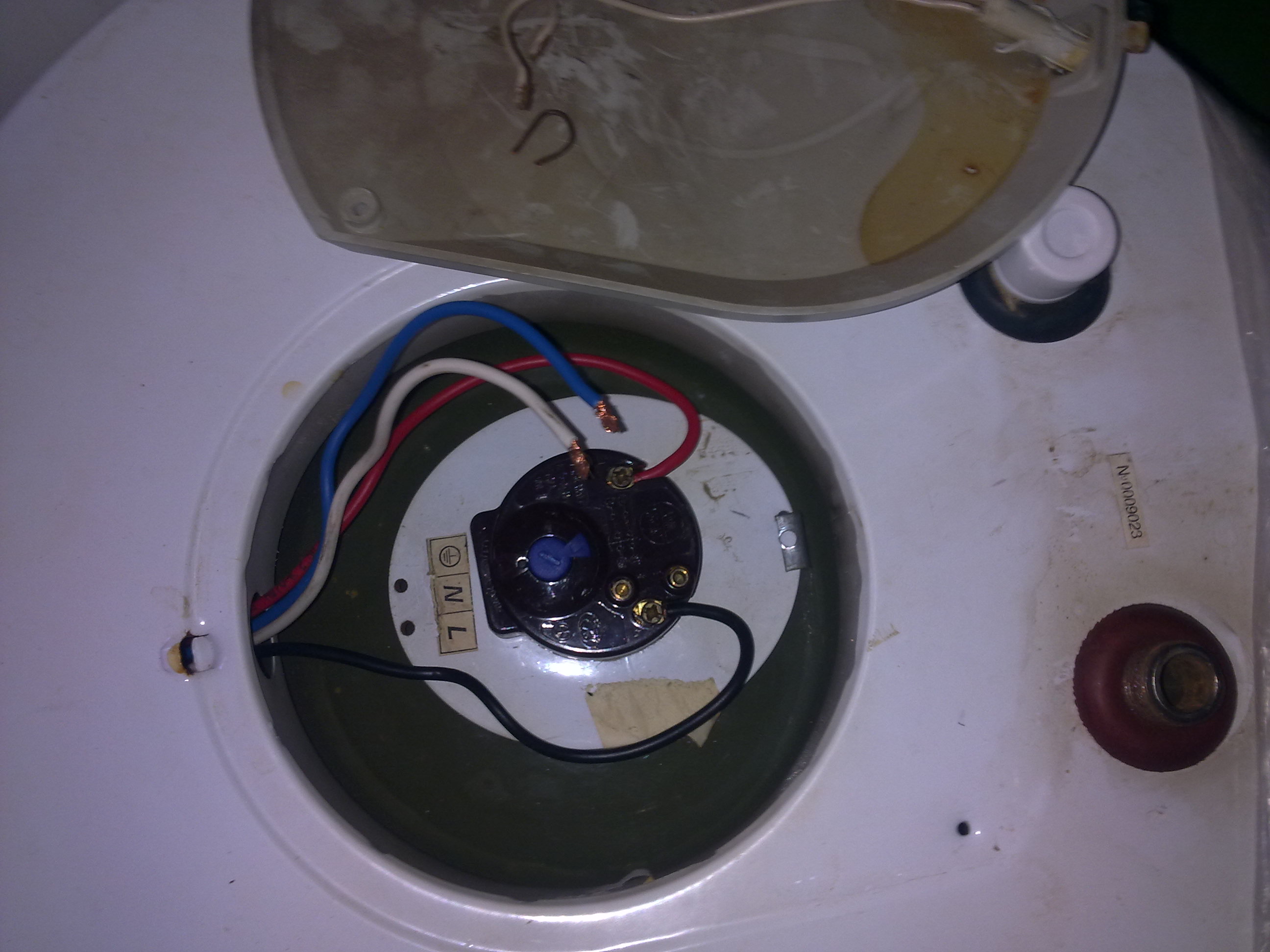 Правилно си се ориентирал колега. Белия проводник е за фазата, синия за нулата.Закачи ги на една лустер клема. За зануляването е хубаво да имаш трипроводна линия до бойлера и някъде на корпуса да има винтче или резбова колонка за да се закачи заземителния проводник. Ако нямаш заземителен си вържи от нулевия /синия/ един някъде до корпуса. Двете дупки върху комбинирания терморегулатор са точно за лампата.