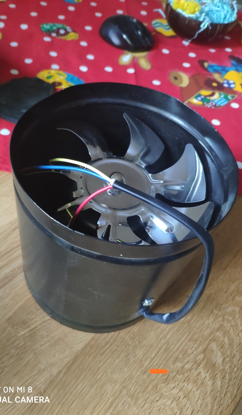 Аспиратора в кухнята отвежда засмуканият въздух директно към тавана.На два метра от него има отвор с друг вентилатор,който някой е решил да отнесе миризмите навън.Така.Аспиратора е изкормен отвътре,запазено е таблото с превключвателя,осветлението и филтъра.Прекарах въздуховоди през тавана и го отведоха до въпросният отвор на стената.Дотук беше лесно.Закупих моторче,с което да заменя съществуващото с идеята да е малко по-мощно и по-тихо.Моторчето е аксиално.Дано това е правилното наименование.50херца,40 вата.От плъзгача на аспиратора излизат четири проводника за съответно три степени на двигателя.Новият,прибързано закупен,има три проводника.
