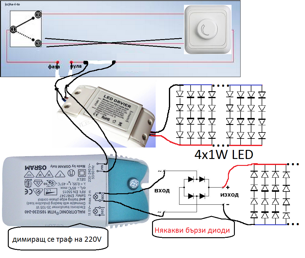 2. Такъв димиращ се драйвер има но той е за халогенни лунички, и въпроса ми е дали на изхода на променливото, може да се сложи грец но с някакви бързи шотки диоди предполагам, за да мога да изправя напрежението и захраня диодите?
