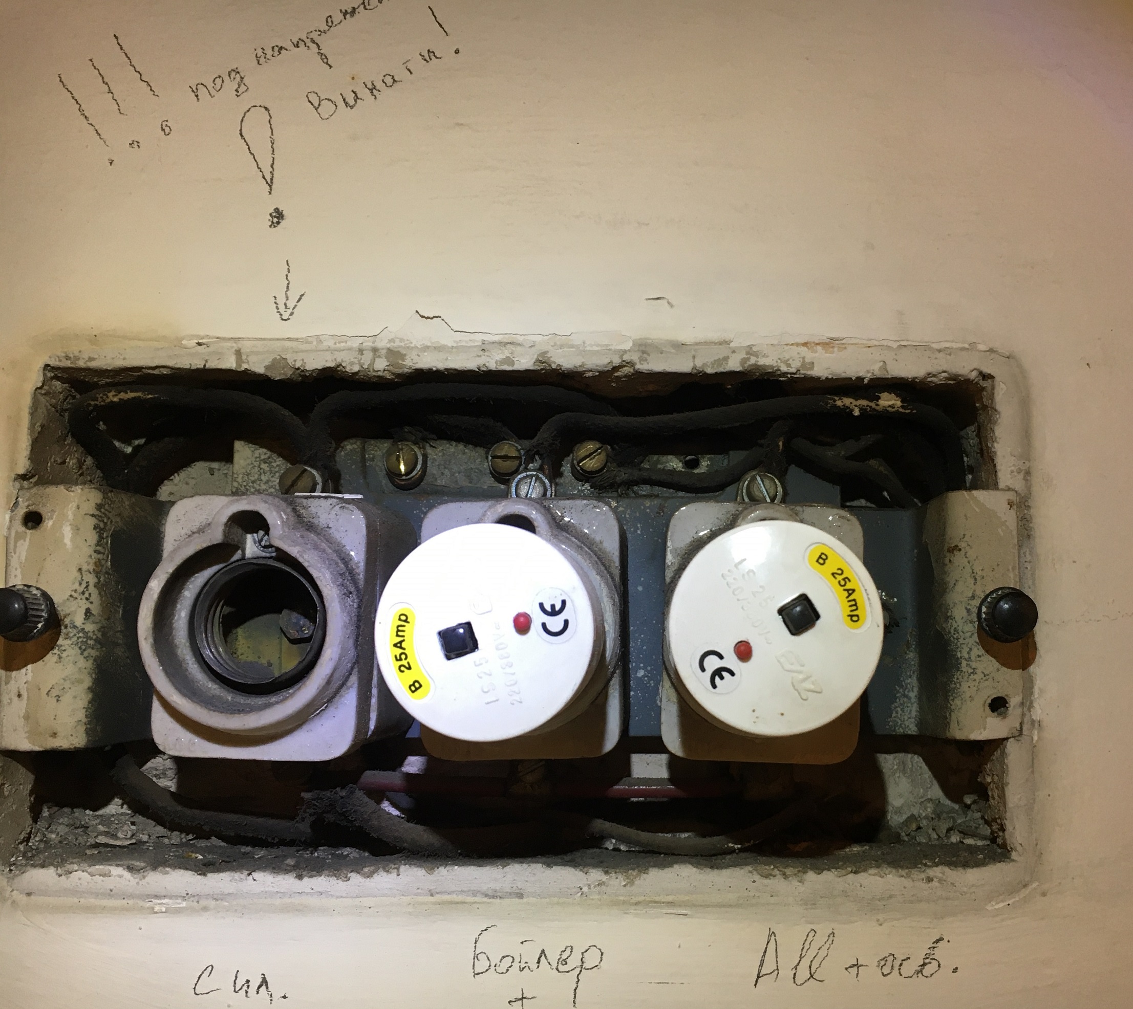 4. Отвивам и трите бушона - "силовите" контакти остават под напрежение!!! Замервам над най-левия бушон и установявам, че отгоре си има фаза! И доколкото успявам да видя, тя влиза отвън в таблото заедно с другата фаза, която е вързана на шината отдолу и нулата, т.е. 3 кабела влизат в апартамента.