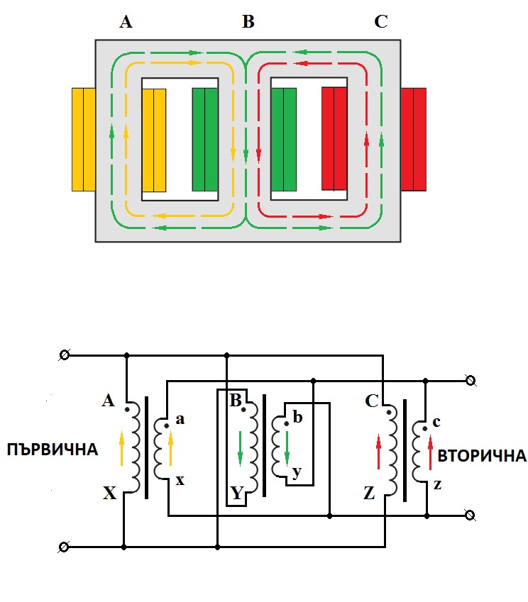 На принципната схема съм обединил намотките, но трафа е трифазен. Целта е стъпаловидно регулиране на тока в изхода.