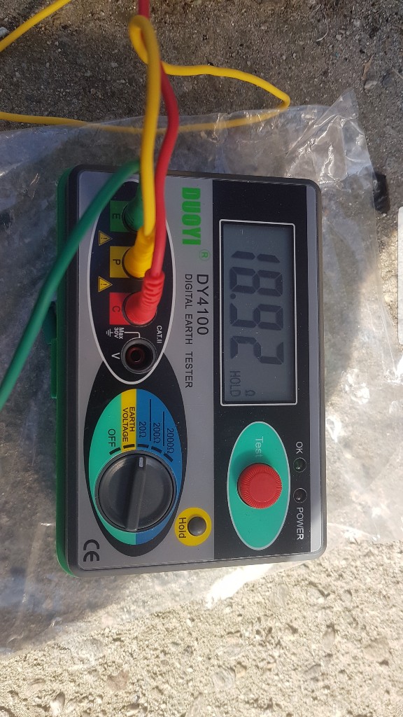 Набих още един кол, свързах го с първия и получих 11 ома съпротивление. Измерих и напрежението между L-N-PE (моето земно), като показа следното: