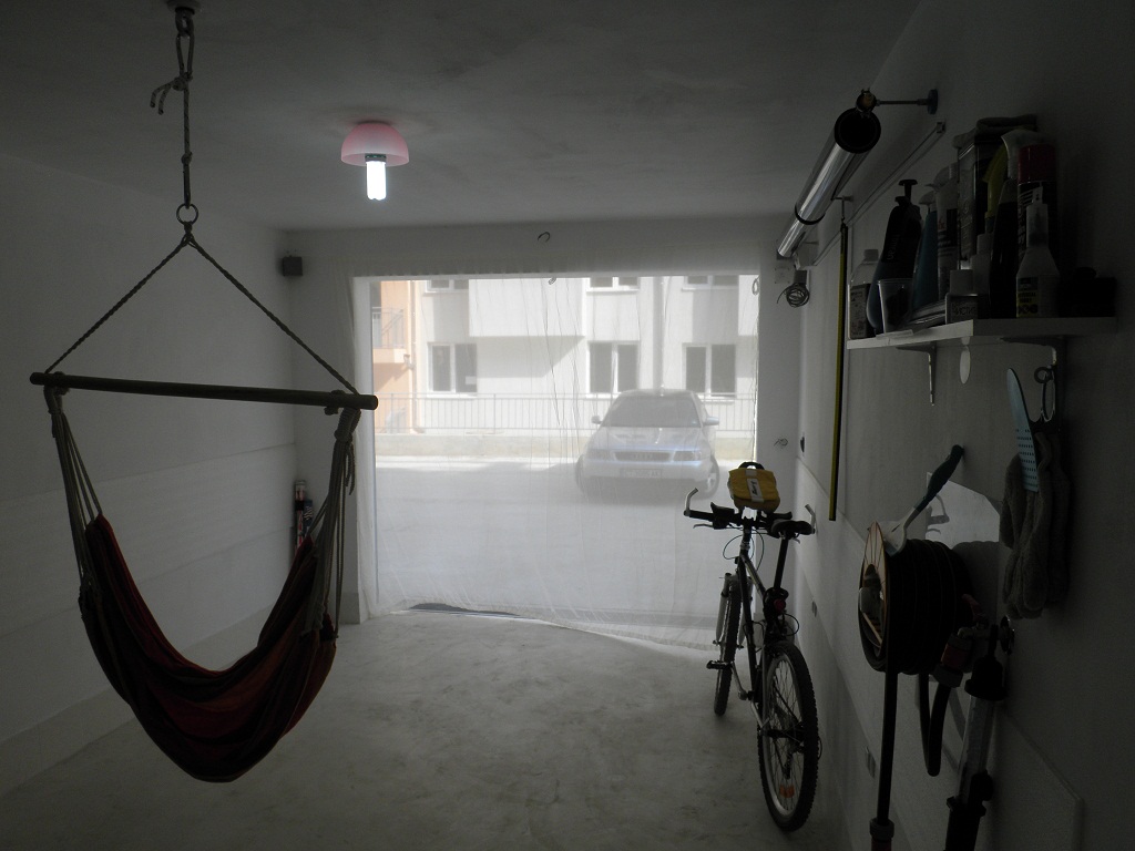 При мен идеята беше въобще да не вкарвам кола, затова след металната врата предвиждах прозрачна подвижна преграда. Ако ползвам битовата част, отива към металната врата (хем да не стоя вечно на затворено). Ако ползвам работилницата - влиза навътре и предпазва другата част от замърсяване. Понеже не я доизмислих, така си и остана нереализирано подобрението.