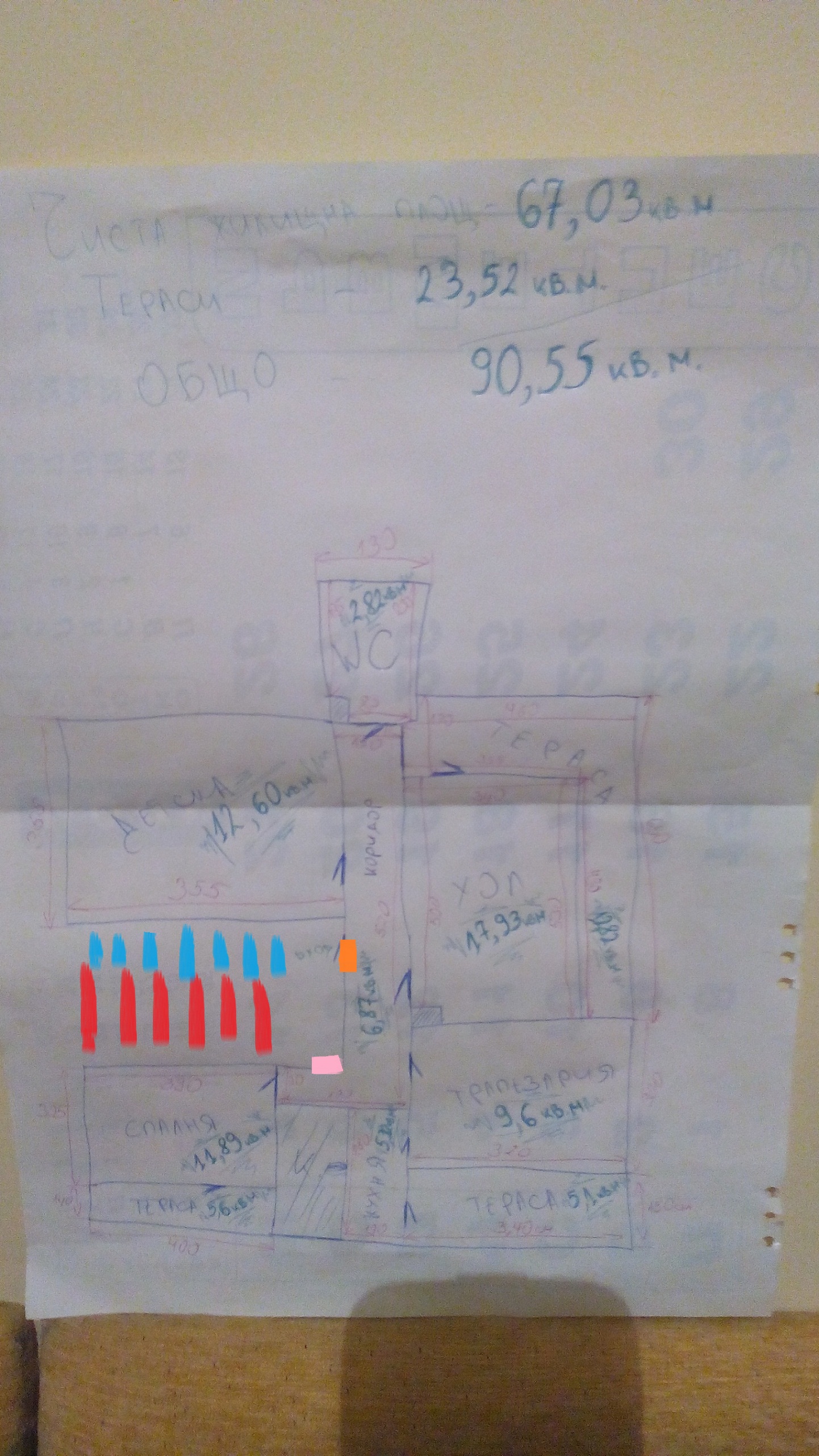 Стълбището е където е червеното и синьото. Оранжевото е врата ,която я има в момента тя ще остане за братовчед ми. А аз ще си избия там където е розовото. Ако не са съгласни съседите , банята ми е да е над терата и част от холът им? А този проек нещо ориентиравачно като пари можеш ли да ми кажеш? Благодаря :wink: