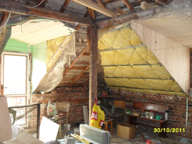 През 2011 започнах и не бързам много(ще бъде детска стая,детето е на 5).Повдигнат покрив,преграден на две таван,санитарен възел.На покрива 15см. вата ,в стените(от картон) 10см.На пода 5см. фибран и подово отопление.