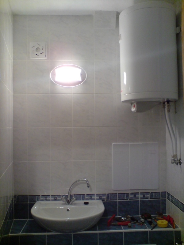 Един месец и една седмица ми отне всичко, от бутане на старите плочки, нови ППР тръби само за тях виках един приятел, че не си заслужаваше да си купувам и лепачка. Машинка за рязане на плочки взех, ща не ща. Копаене на канали за пералнята, сифона и водопровода. Оправяне на обратните води и лепенето на новите плочки. После и връзване на уредите.