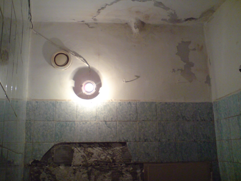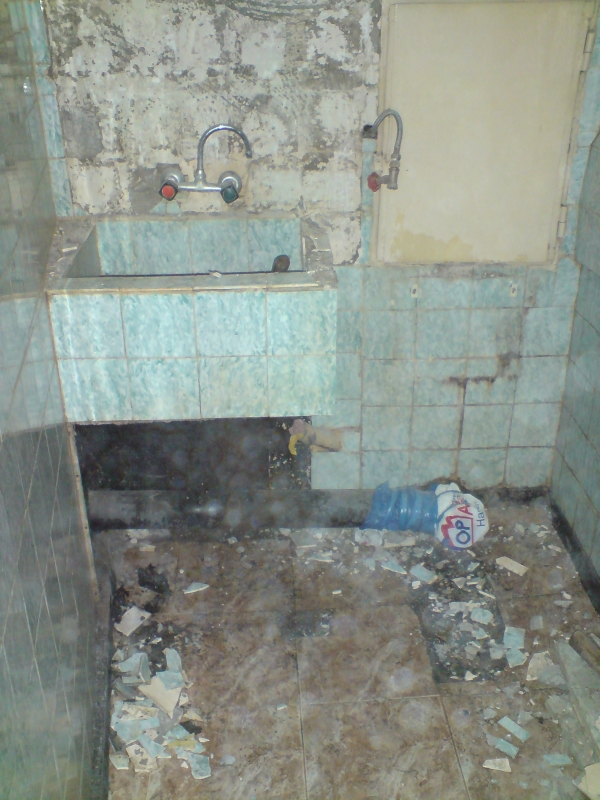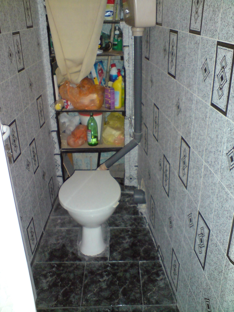 Показвам първо старото положение на банята, вече бях съборил част от рафтовете и клекалото преди да се сетя да снимам. Трите стени са гипсови и се наложи лятата мивка да я отлепя с хидравличен крик, за да не паднат стените.