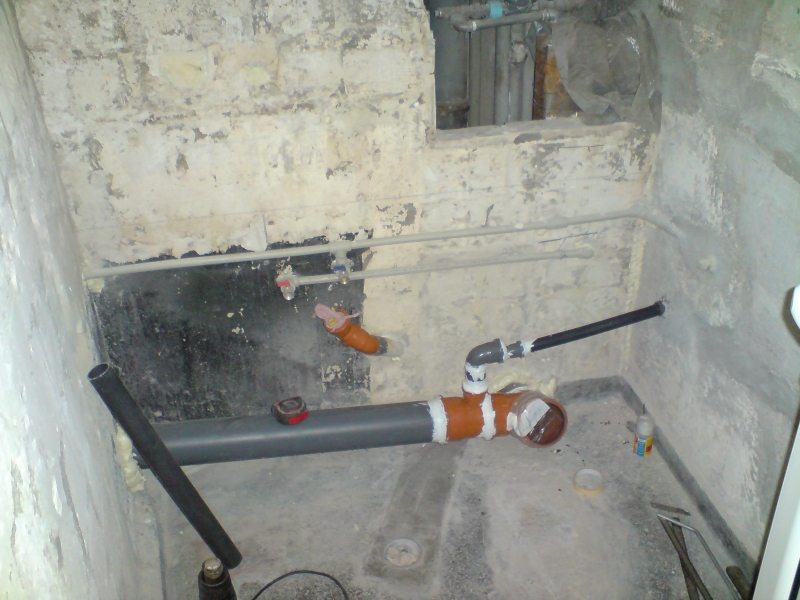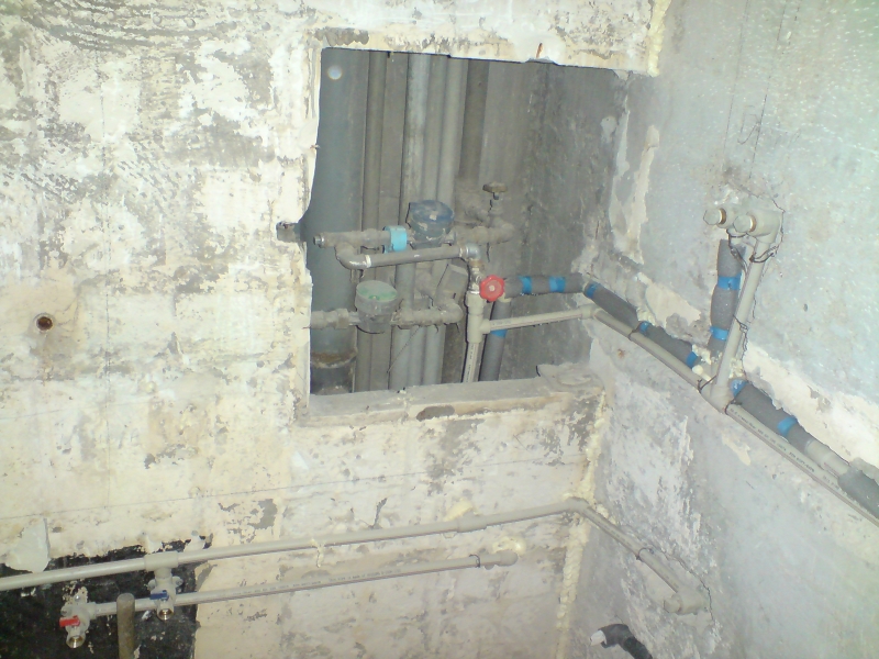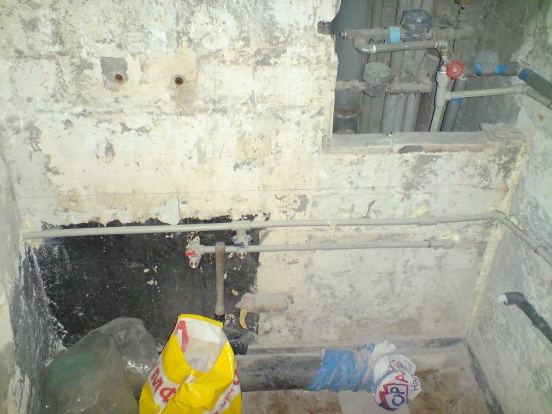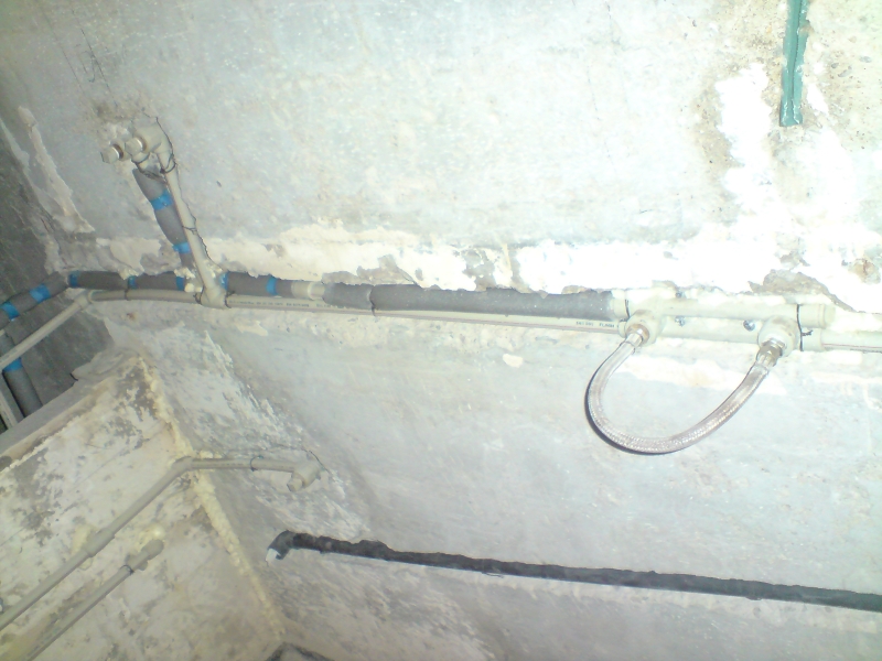 След бутането дойде планирането. Не исках да има оплетия кабели тръби и тръбата за обратната вода на пералнята, която е в шкаф пред банята, я заложих с пвц тръба фи32 в бетонната стена, през банята минава и водопровода за кухнята с 6 метра тръби през целия коридор, смених и тях.