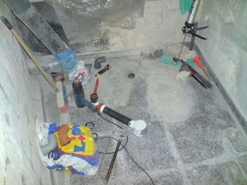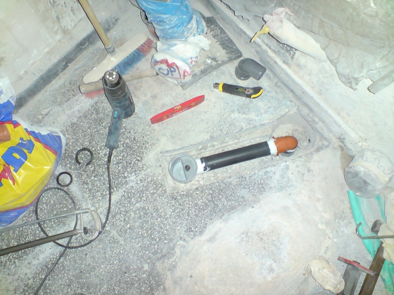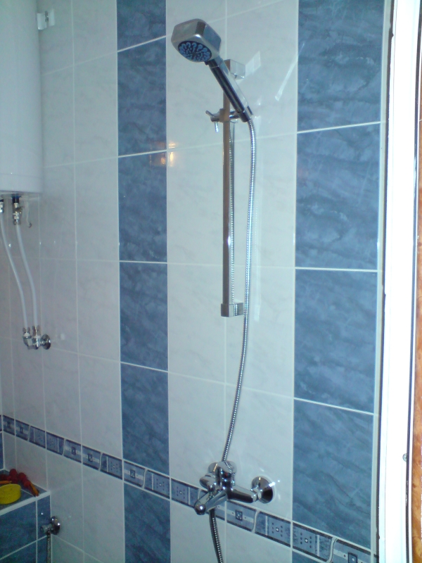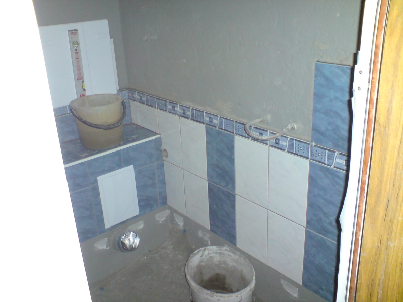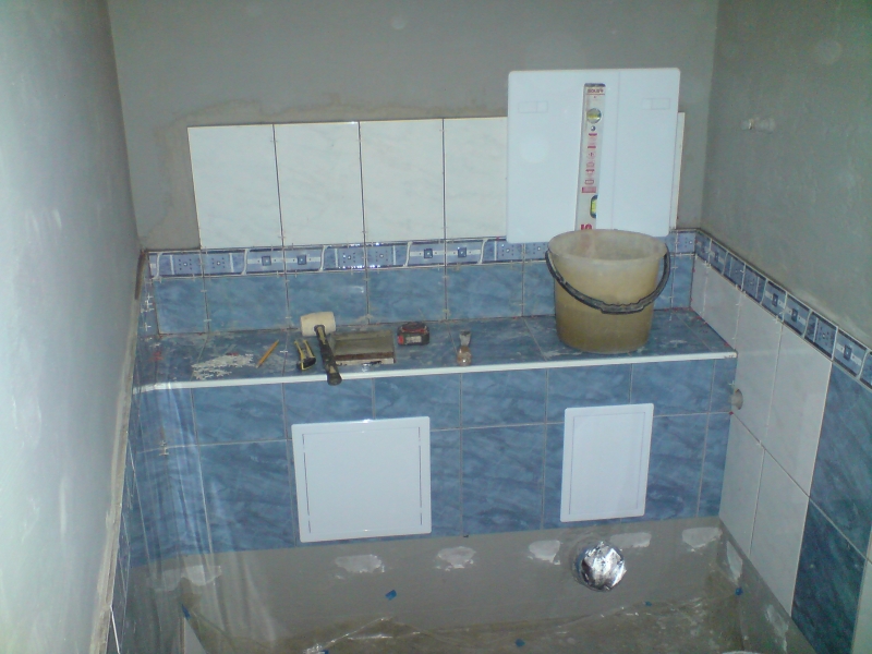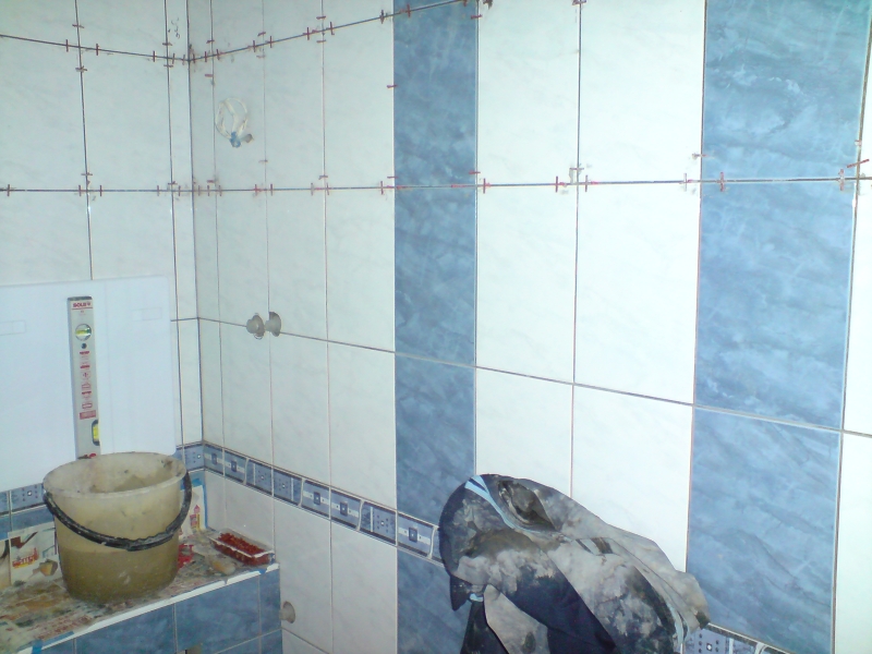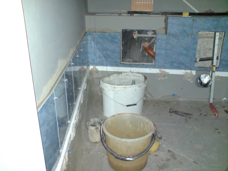 Един месец и една седмица ми отне всичко, от бутане на старите плочки, нови ППР тръби само за тях виках един приятел, че не си заслужаваше да си купувам и лепачка. Машинка за рязане на плочки взех, ща не ща. Копаене на канали за пералнята, сифона и водопровода. Оправяне на обратните води и лепенето на новите плочки. После и връзване на уредите.