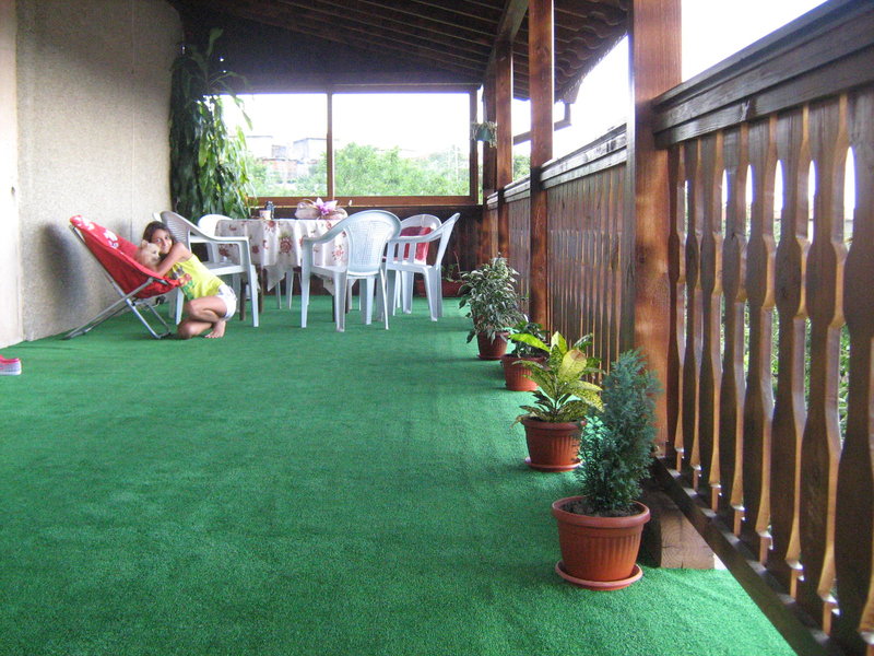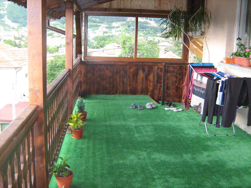 След като направихме терасата,и преди още да сложим парапетите се оказа,че вятъра ще е голям проблем.Оказа се ,че има едно постоянно течение и не е приятно като постоиш по дълго.А при вятър пластмасовите столове летяха из градината.Трябваше да затворя двете къси страни на терасата(или чардака :wink: ).След дълго умуване,с какво да го направим Семейния съвет (аз и жената)реши да бъде до половината с ламперия а нагоре плъзгаща дограма.Учудващо как тези две малки стенички промениха коренно микро климата на нашата тераса :) Сега и при много силен вятър на терасата се усеща като слаб ветрец.