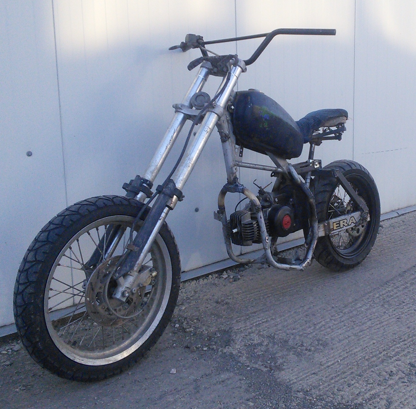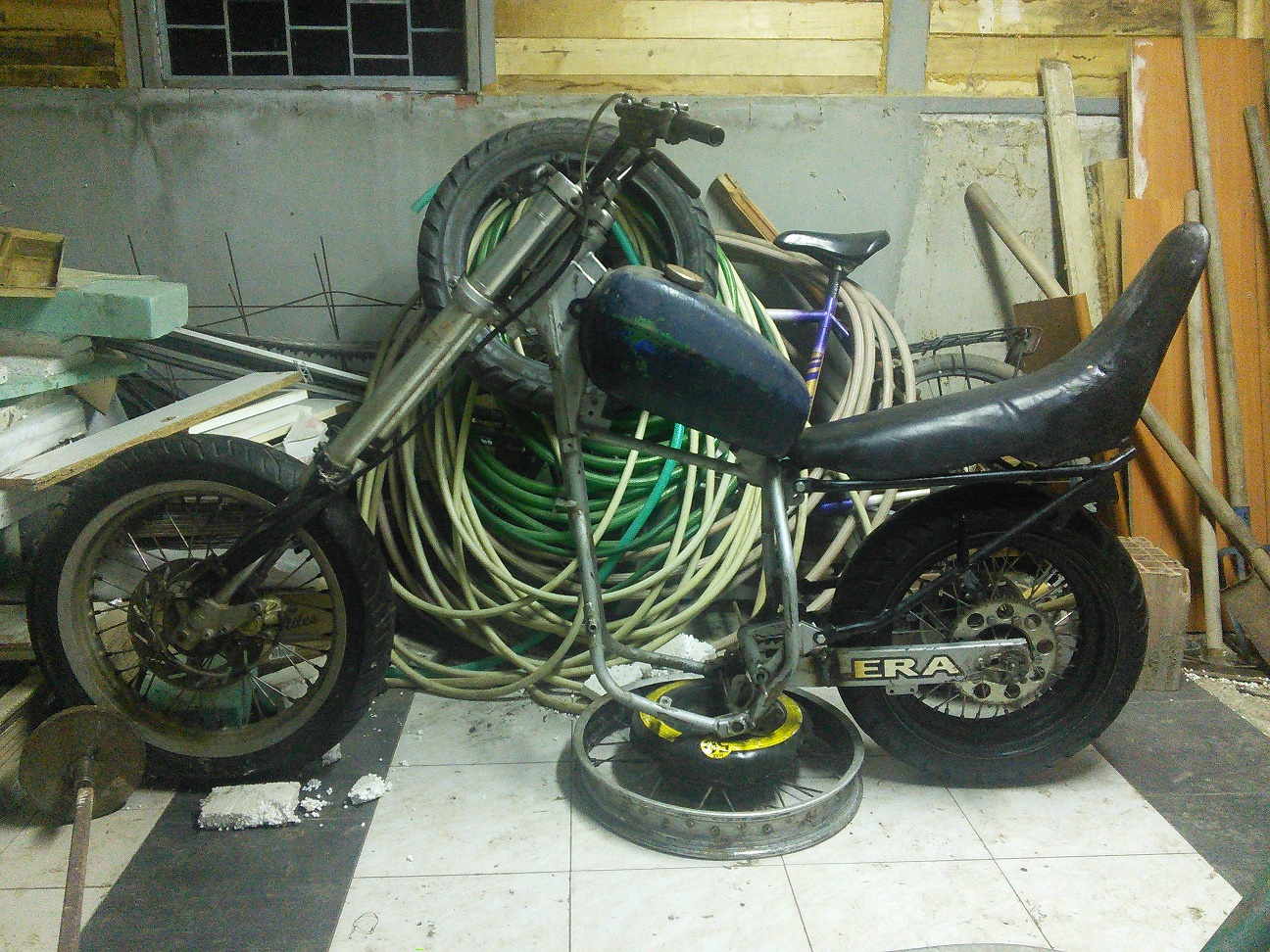 Сега сглобено в груб вид изглежда така: За основа съм ползвал ендуро мотор Gilera GSM 50. От него взех само рамката предната вилка, колелетата, седалката и стойката дето държи седалката, ид неща които ще се виждат от снимката. Задното колело го направих от резервана гума тип патерица: ,