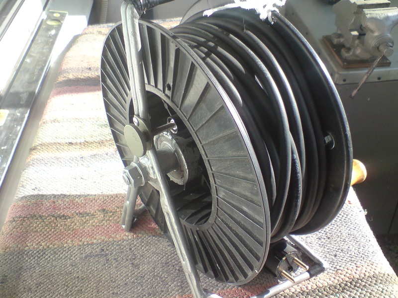 При мене кабела е навит обратно-по удобно е ,като държа стойката с лявата ръка и въртя с дясната напред. Освен това съм сложил едно Ф8 ,заварено към вертикалата ,плътно до двата ръба на макарата-така като навивам кабела,същия не може да "провисне" и да излезе извън страниците на макарата.