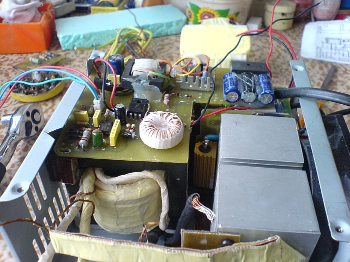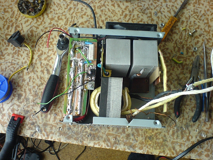 Различават се и стойностите на елементите определящи честотата и коефициента на запълване на импулса - при мен първия електрожен е с 45%, а второто е с 43%. Снимки на трафа имам само на малкото.