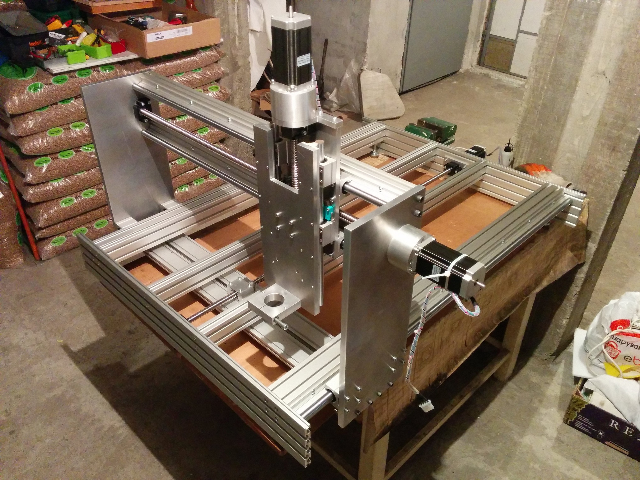 Да се похваля, Z движението, което беше проблемно е сглобено и върви. В крайна сметка винта се оказа прав, шийките много криви (с около 17 стотни биеше всяка). Стругаря намали диаметъра на шийките и наби втулки върху тях. За целта си изработи цанга с която да захване винта, защото центалните отвори в двата края бяха неконцентрични с винта и не можеха да се използват. Ето снимка на сглобената вече машина!