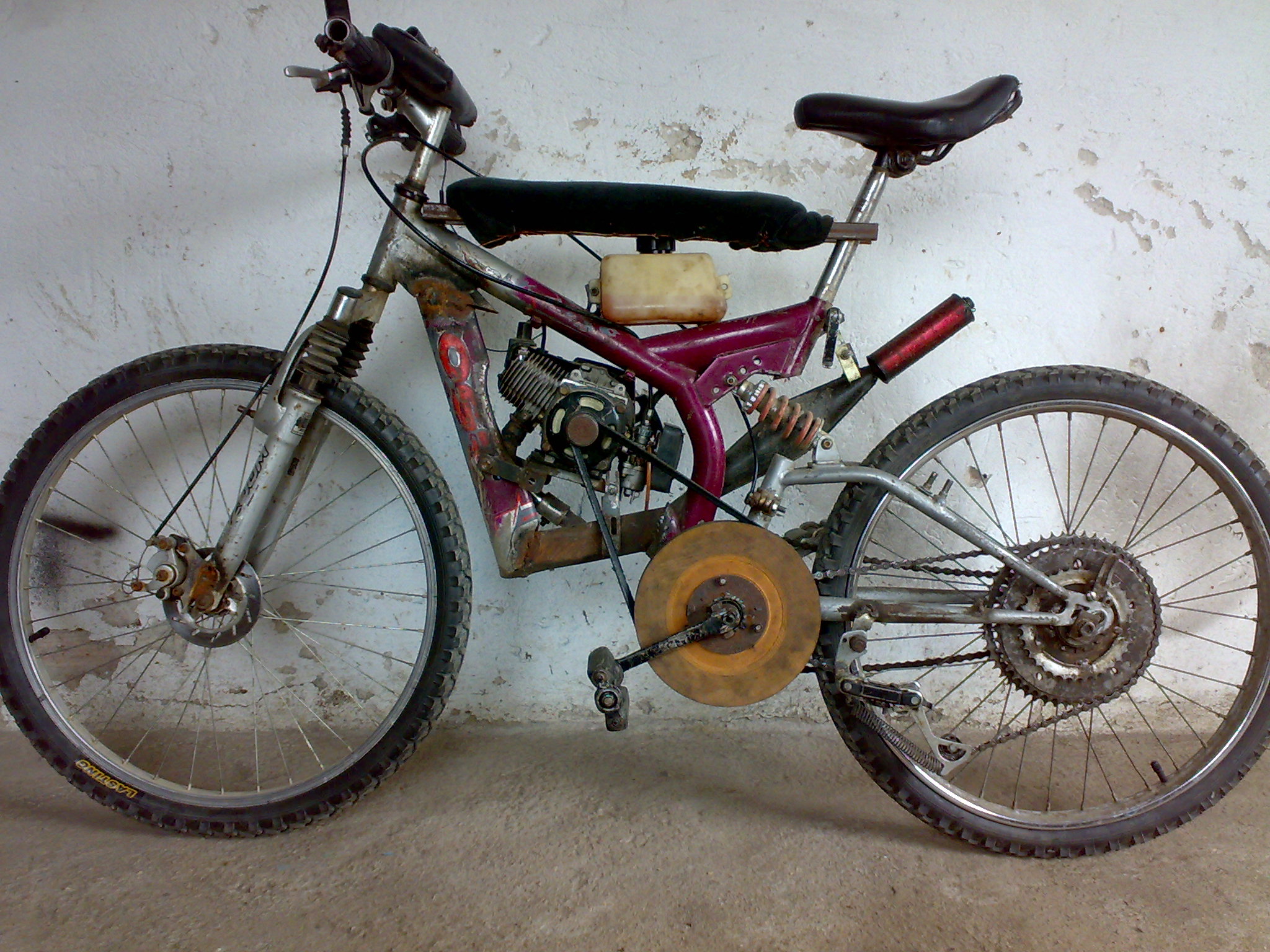 Темата ми стана интересна... с един приятел решихме и ние да си направим нещо такова реди бая време,не се получи кой знае какво но все пак ни харесва(все пак ние сме си го правили),двигатела взехме от едно малко руско моторче на него пишеше MINI,50 кубика е,и след като го сложихме на колелото се почи това: