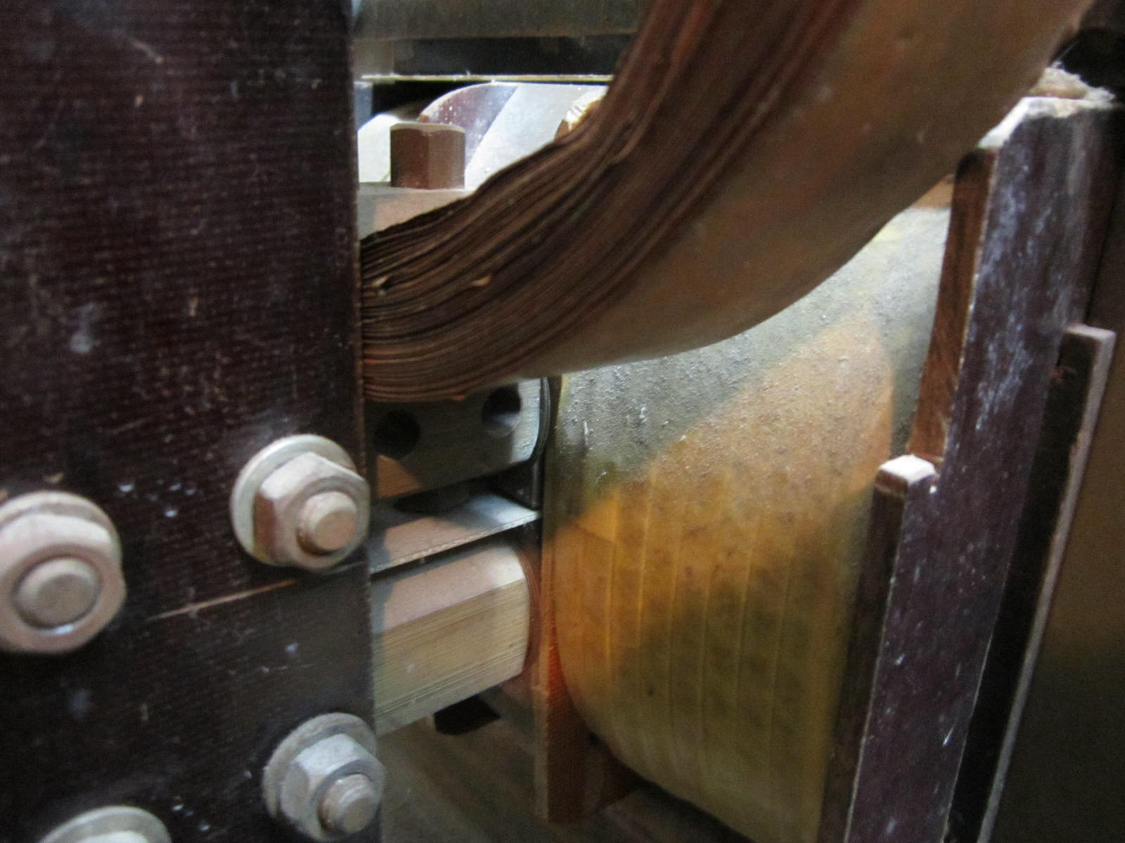 Трансформаторът е "Ш"-образен - "Ш"-70х120 или 84 см2. Вторичната е една навивка от плътна, кръгла "филия" мед, която в средата е с фрезован (изпразнен) правоъгълник, отговарящ на размера на средното ядро на трафа (плюс дебелините на макарата). Там, където са изводите за шестостенните, месингови, тоководещи електроди, "филията" е срязана, (за да не става навивка на късо), и радиално в нея са направени две резби (непосредствено до среза), в които резби се завинтват електродите. В среза е сложена изолационна, дистанцираща прокладка от стъклотекстолит, за да не може той да се затвори. Електродите са три броя - един неподвижен долу, къс и също неподвижен в средата, и един подвижен в горната част. Между късия и подвижния електроди има "Ф" - образна, гъвкава, медно-ламелна връзка, както и пружина, която държи подвижния електрод в отворено състояние (вертикалната черта в буквата "Ф"). Тя, пружината, някъде се изгуби през последните 30 години, но винаги мога да я възстановя. И трите тоководещи електроди са фиксирани един спрямо друг чрез фасонни, текстолитови пранги. Долният и късият електроди, които са изводите на вторичната, се съвместяват по позиции с резбите и прангите чрез тънки медни прокладки (от същия вид ламарина, от която е и гъвкавата "Ф" образна връзка). Първичната също е на средното ядро, но е разделена на две части, между които е вторичната (трансформаторът е направен по възможност с максимално твърда характеристика). Проводникът на първичната е правоъгълен - "ПСД". Захранването естествено е монофазно, но е на 380V.