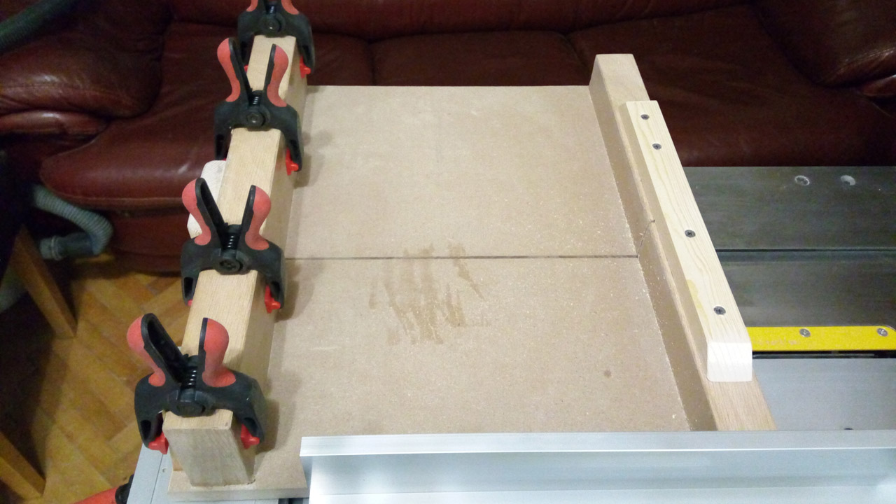 Залепих парче фурнир, като оставих да стърчи по 5мм от краищата, сложих отгоре една летва да изравни натиска и го стиснах с всички налични стяги, които имам.