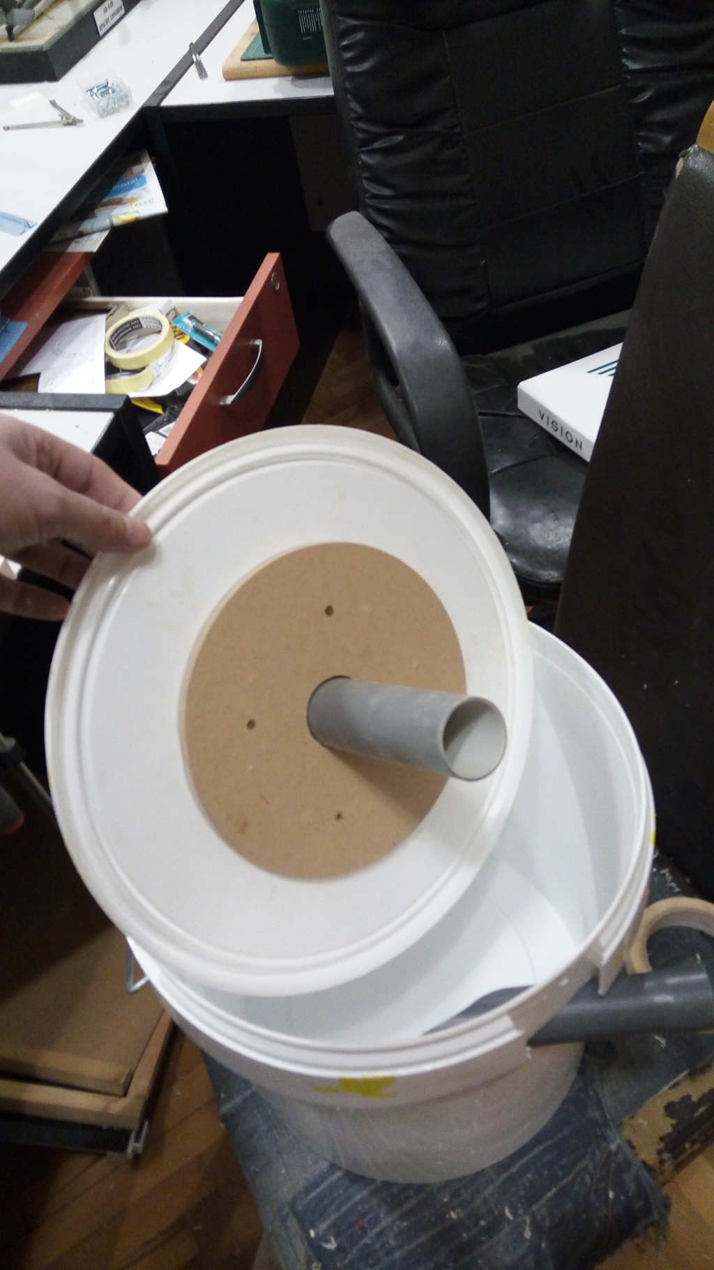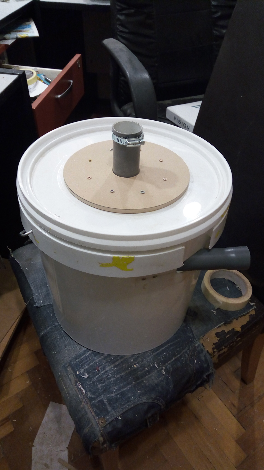 :? Що си мисля, че аспирацията е вързана грешно. Идеята е шпилките да влизат под ъгъл и завихрянето да ги спуска надолу. Прахосмукачката трябва да е включена отгоре на кофата.