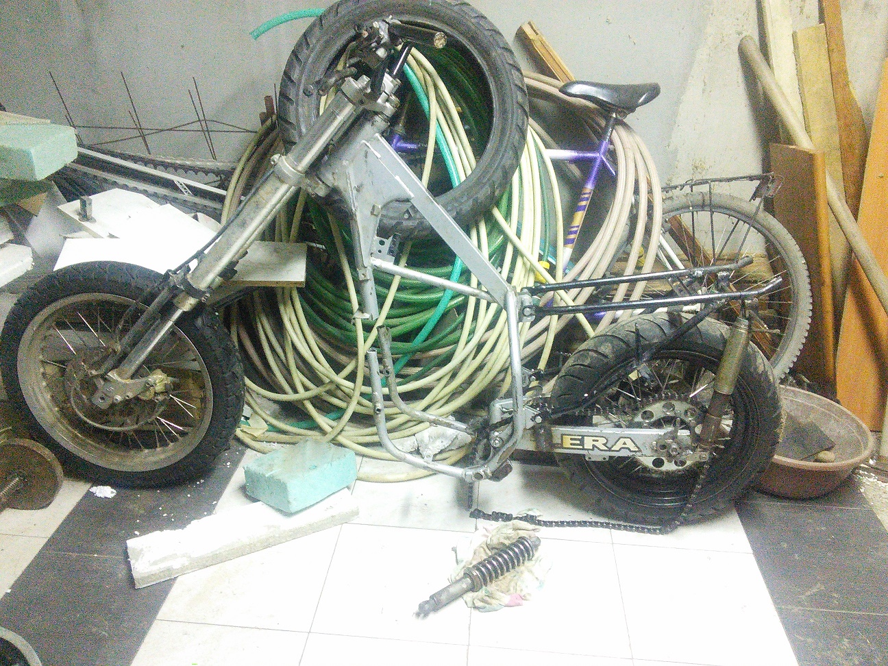 Сега сглобено в груб вид изглежда така: За основа съм ползвал ендуро мотор Gilera GSM 50. От него взех само рамката предната вилка, колелетата, седалката и стойката дето държи седалката, ид неща които ще се виждат от снимката. Задното колело го направих от резервана гума тип патерица: ,