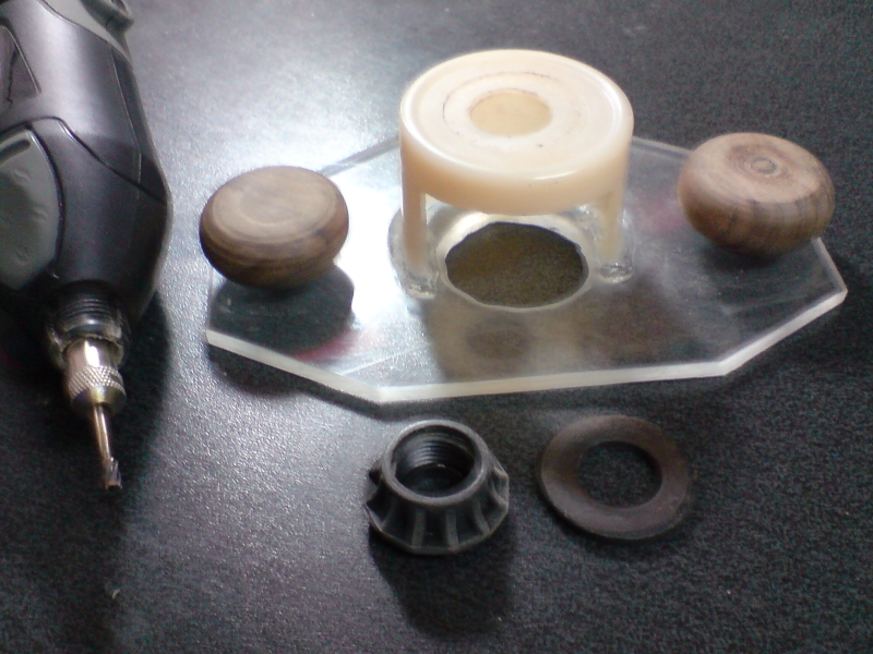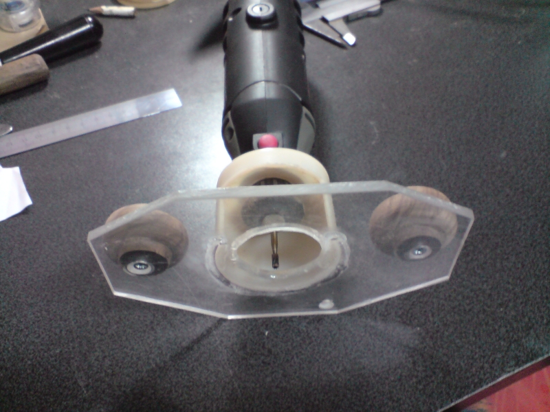 От подръчни материали, плексиглас, пластмасова кутия, шайба с отвор да минава оста на дремела и две орехови дръжки се получи това. Реглажа на дълбочината става от цангата с издърпване и прибиране на фрезерчето. Другото става ясно от снимките. Днес го пробвах върху букови чирени , стои стабилно и няма вибрации.