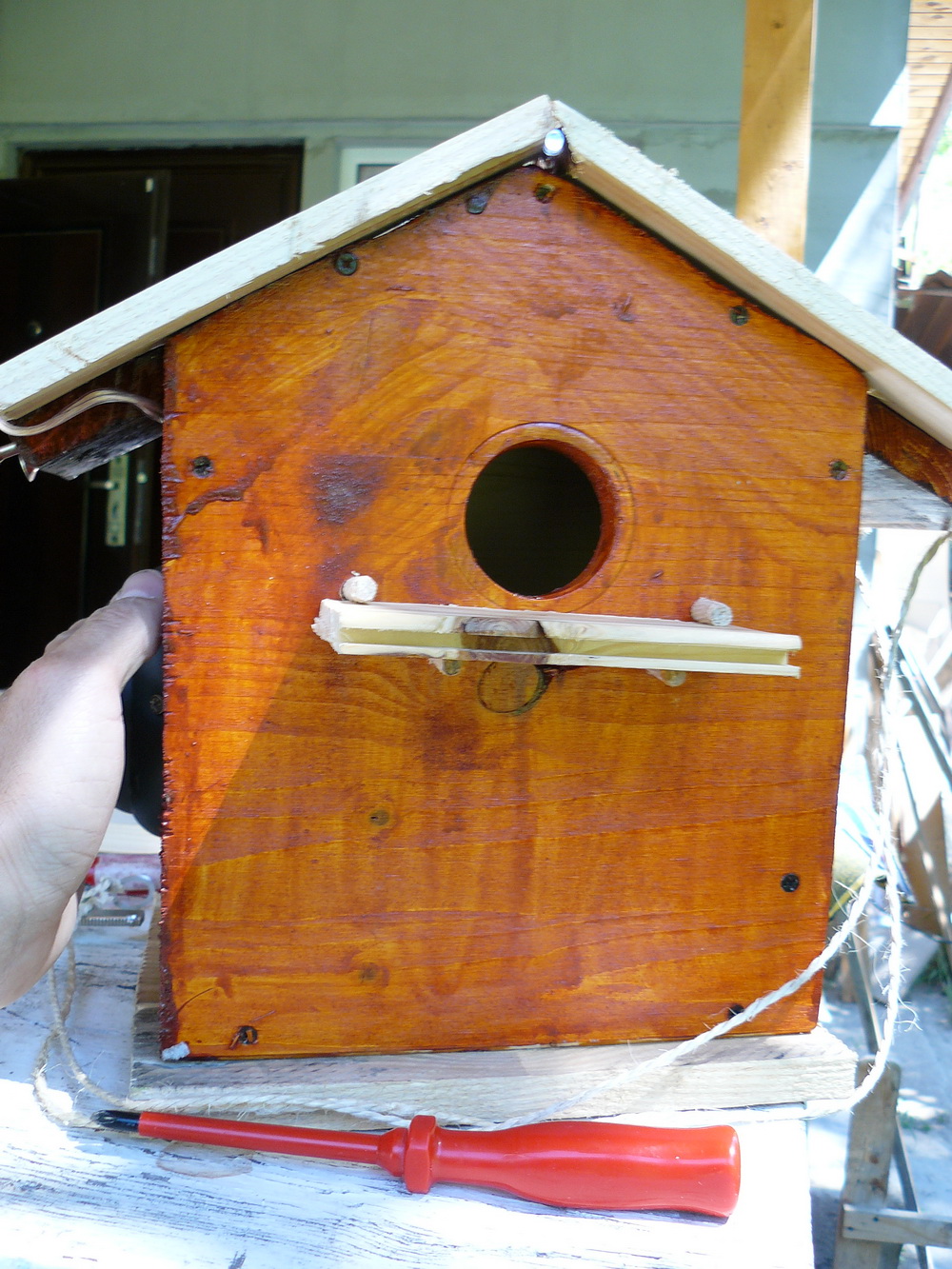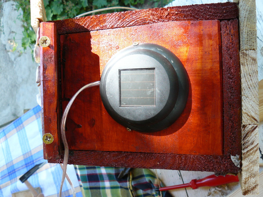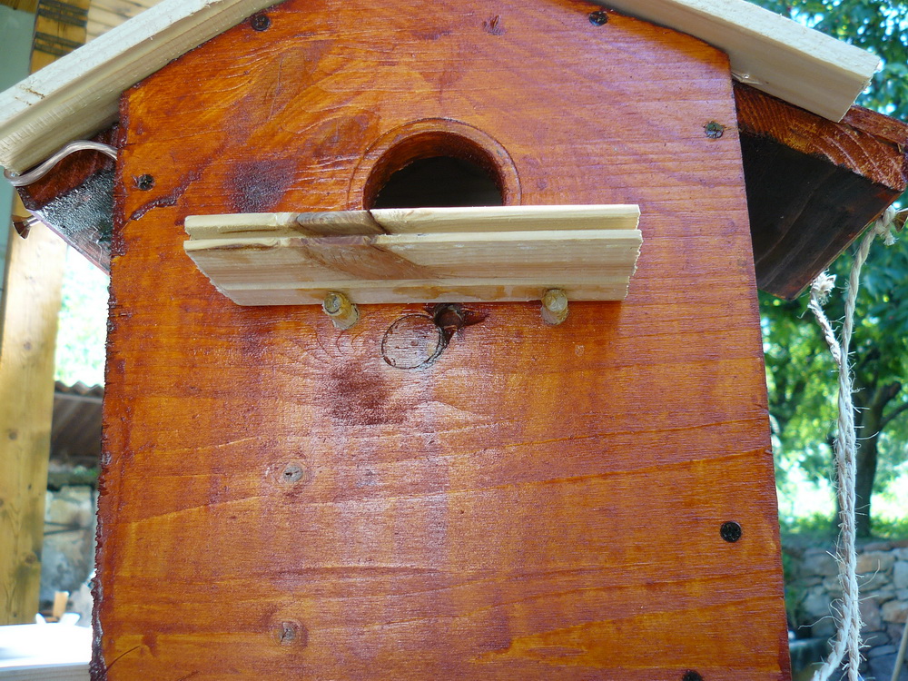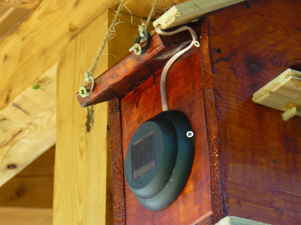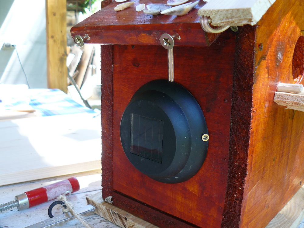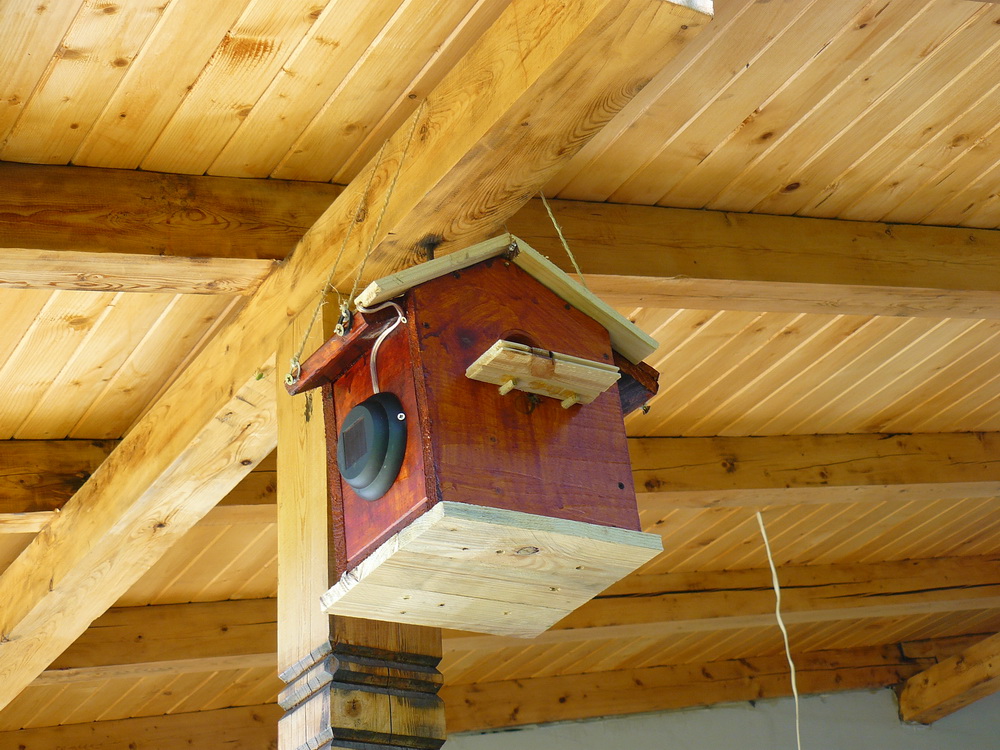 За тази идея прочетох преди време. Направихме тази къщичка с малкия през юни'10 , обаче не беше довършена, преди няколко дни видях няколко птички да се въртят около стряхата на вилата, явно да гнездят и реших да довърша проекта. Добавих соларният панел със светодиода с идеята насекомите вечерно време да се въртят около къщичката привлечени от светлината. Ако птичките се настанят ще добавя още снимки.