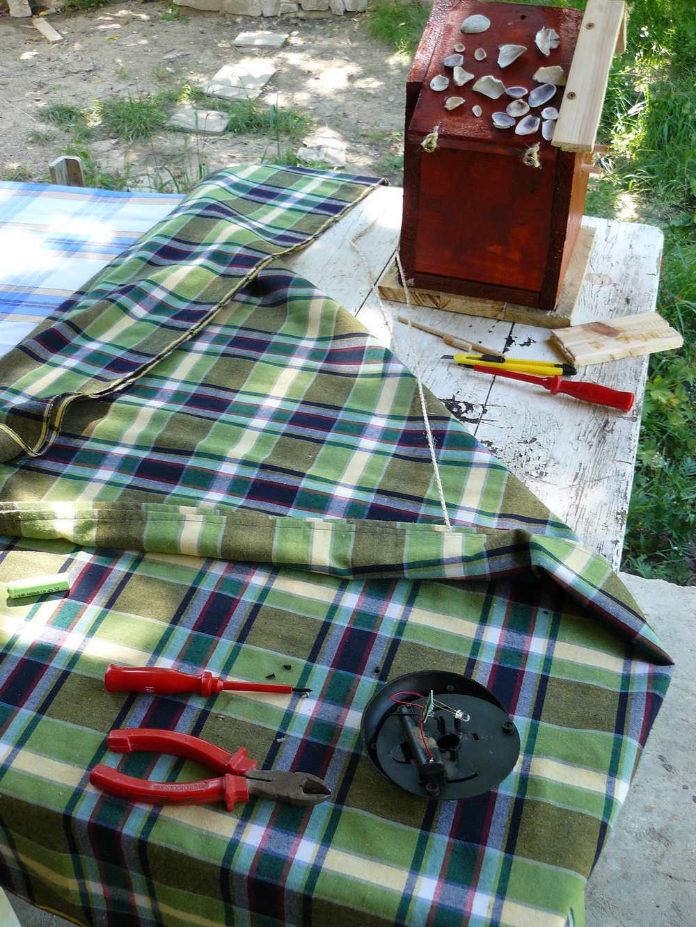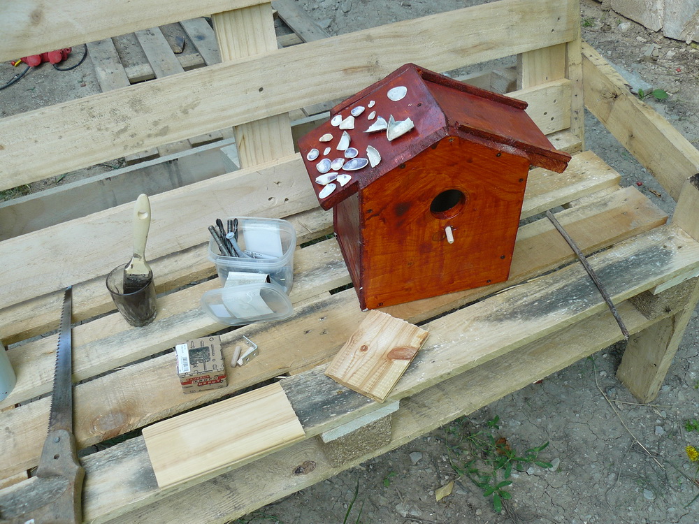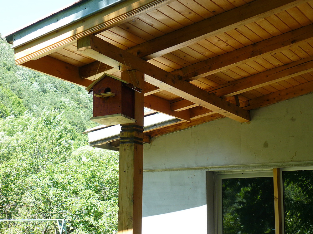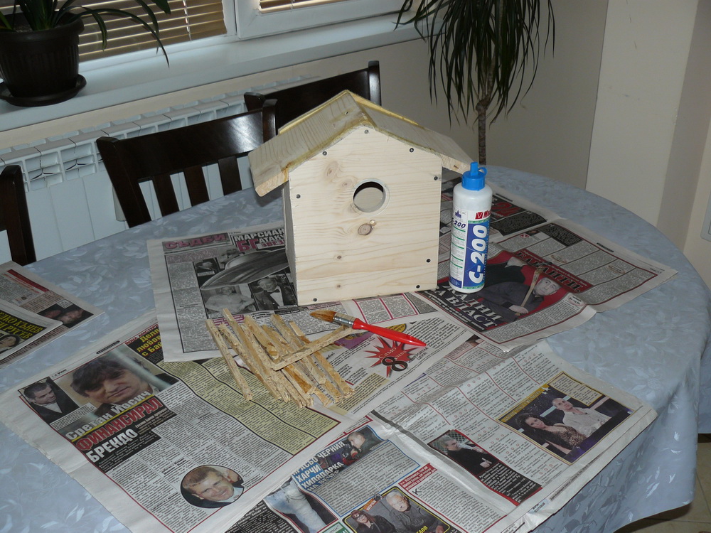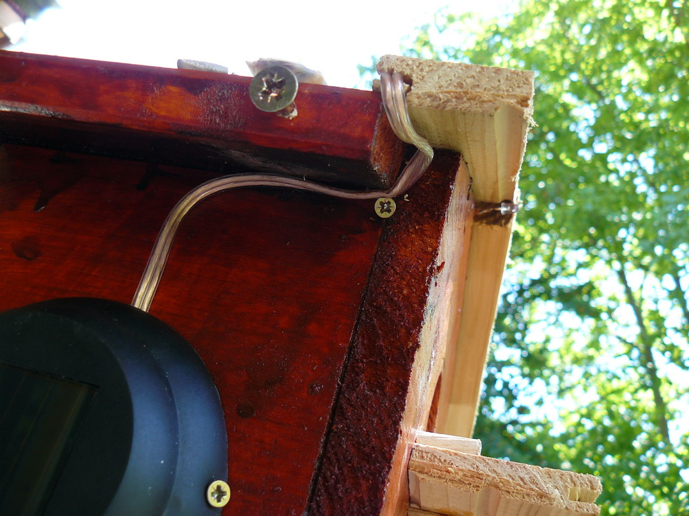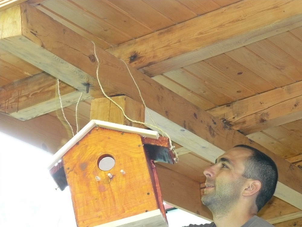 За тази идея прочетох преди време. Направихме тази къщичка с малкия през юни'10 , обаче не беше довършена, преди няколко дни видях няколко птички да се въртят около стряхата на вилата, явно да гнездят и реших да довърша проекта. Добавих соларният панел със светодиода с идеята насекомите вечерно време да се въртят около къщичката привлечени от светлината. Ако птичките се настанят ще добавя още снимки.