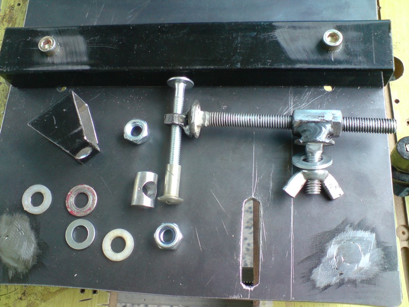 Сглобих стойката от едно парче кутия 40х20мм и шина 50х5мм дълга около 40см. За основа съм отрязал една плоча от черна ламарина 5мм дебелина-220х280мм. Дръжката ми е бонус от белканто. Монтирах ги пробно на парче МДФ за прогонване на размерите.