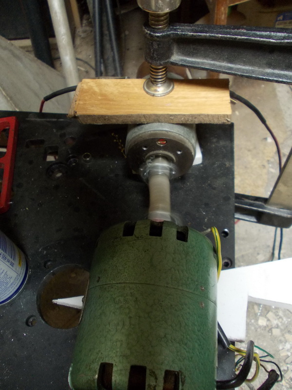 Днес пробвах да отрежа заготовка ф35 от дуралуминий марка В95. За 16 минути я отряза. Въпросното двигателче ми се видя слабо и за да използвам редуктора куплирах директно на задната страна на вала му един постоянно токов електродвигател - получи се значително по-добре. При 20 волта захранване двигателя черпи 2 ампера т.е. 40 вата. Вече оловната тежест е закрепена на винт като продължение на водача. Така в известни граници ще може да се регулира тежестта, а и ще може да се сменя с по-голяма или по-малка. От сутринта от 9 часа до сега (15.30) не съм я спирал - само колкото да сменя парчето за рязане! :-D Кеф - може бавничко да стърже, но не стържа АЗ!!! :weedman: