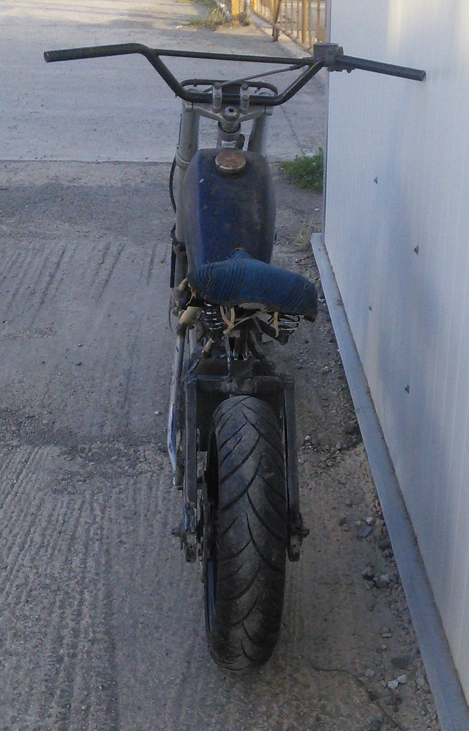 Сега сглобено в груб вид изглежда така: За основа съм ползвал ендуро мотор Gilera GSM 50. От него взех само рамката предната вилка, колелетата, седалката и стойката дето държи седалката, ид неща които ще се виждат от снимката. Задното колело го направих от резервана гума тип патерица: ,
