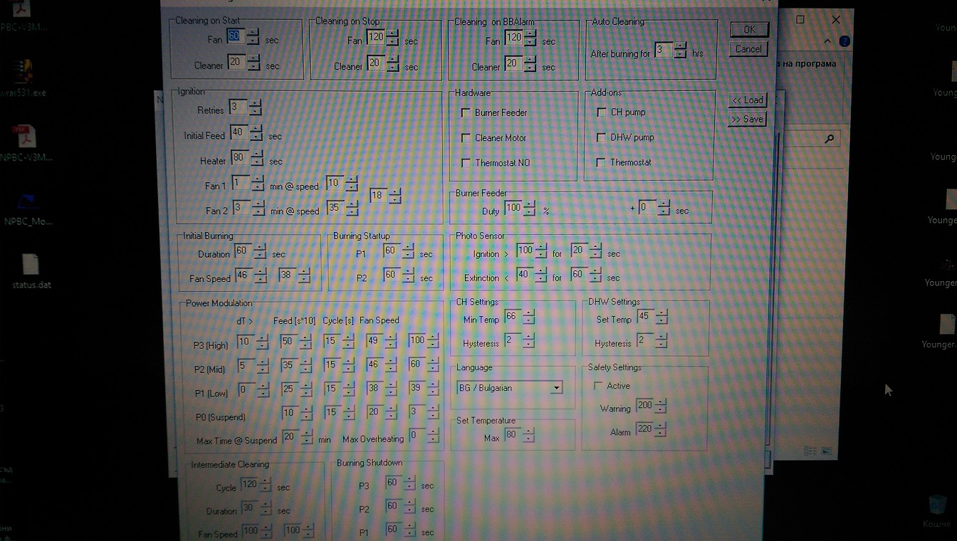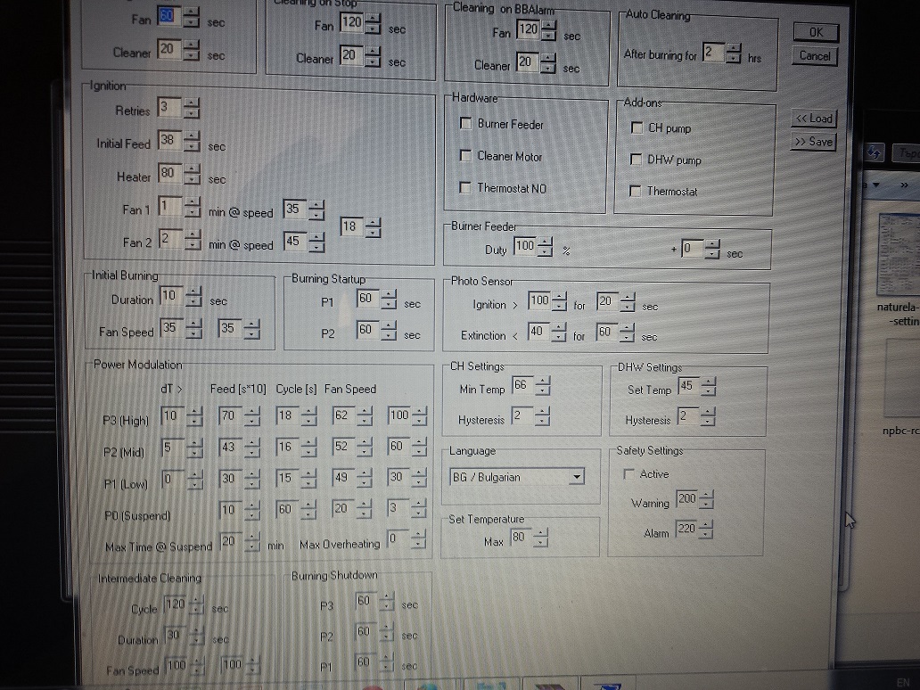 Ами браво, това е поне трети споделен във форума проект! От снимките не става ясно как си монтирал платката - под капака или в оригиналната отделна кутийка? Колкото до настройките - времената на зареждане и на работен цикъл при максимална мощност можеш да ги вземеш от старото управление, но за вентилатора ще трябва да си поиграеш. За ориентир може да ползваш опита на другите колеги, но трябва да ги провериш и евентуално промениш, пък после да споделиш и твоя опит :) . Успех.