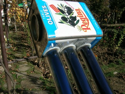 Речено – сторено. Взех една тенекия от маслини от кварталния магазин и направих това: Беше просто за експеримент и даде добър резултат: Тъй като мощността беше слабичка добавих 2 реда огледала 15Х15 см останали ми от слънчевия котлон – концентратор, който бях направил преди десетина години…
