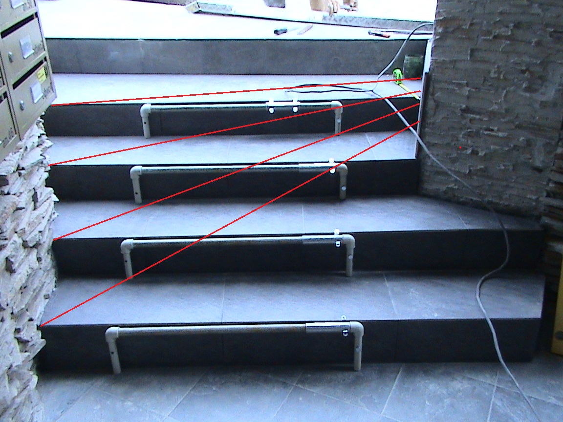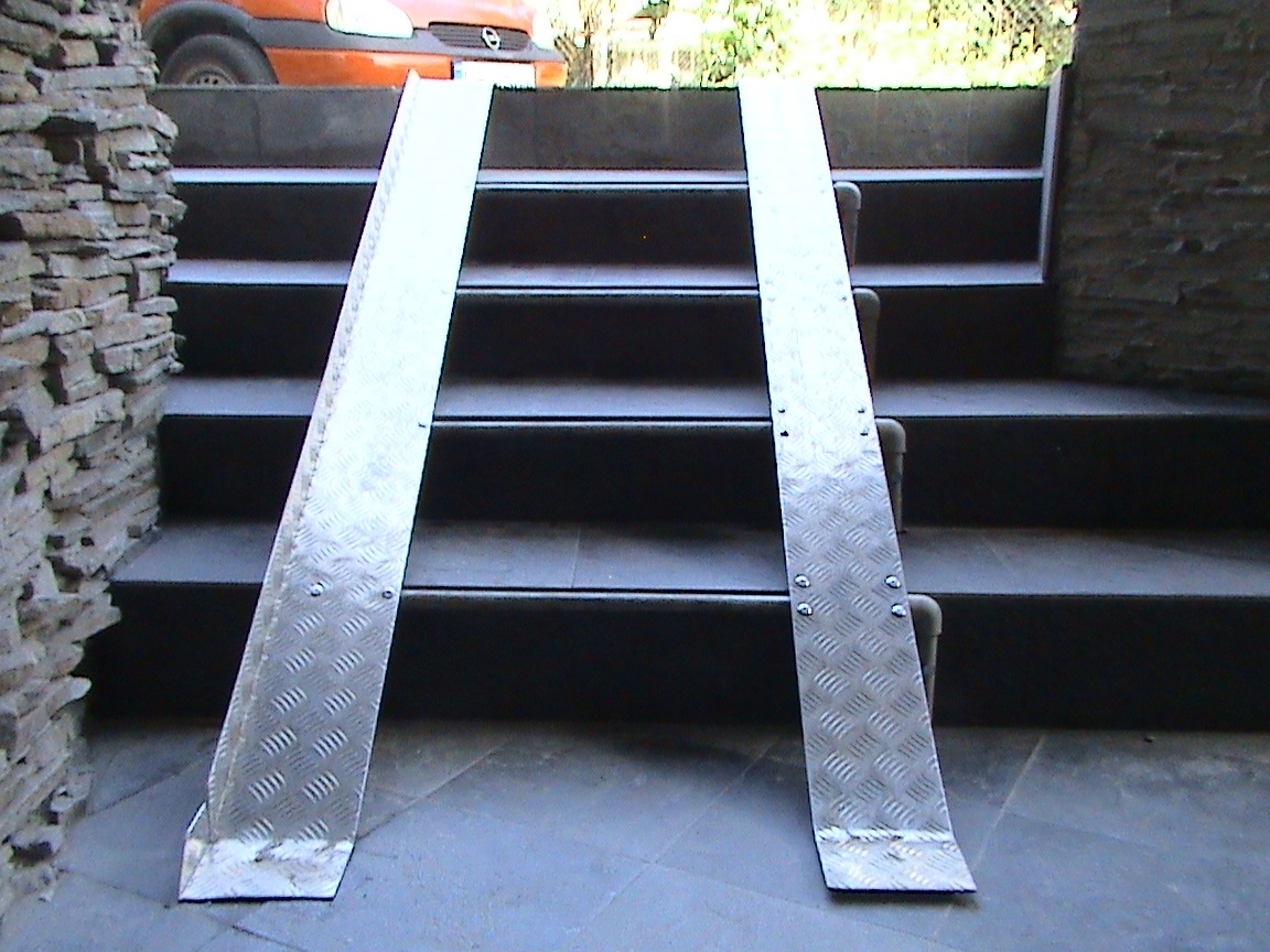 Здравейте.Реших да споделя решението на проблем,който имахме в нов блок.Стълбите на входа бяха триъгълни като на снимка 1 и 2 но в обратна посока.Късно се сетих да снимам,вече бяхме изправили с кофраж,арматура,бетон и плочките. Ъгъла им беше горе долу като червените линии на снимка 3 и постоянно имаше падания особено по възрастните хора.А и според вас майките как си качваха и сваляха количките с децата? Беше си екстремно изпитание.Стигнахме до това решение понеже бебешките колички на съседите са с широчини на колелетата от 52 см. стандартните до 78 см. тип Хамър.Изпълнението не е красиво,но след много ровене по форуми и интернет никъде не видях рампа с променлива широчина за да взаимствам поне някаква идея.Това си е моя измишльотина но за сега върши работа.Първоначалния замисъл беше освен да се променя ширината и да се вдига с панти на ляво към пощенските кутии за да не пречи на стълбите.Отказахме се от това защото става сложно за майките.Идва до стълбите сваля рампата,регулира ширината според нейната количка и след това трябва да я събере и вдигне.Едва ли ще се случва така.