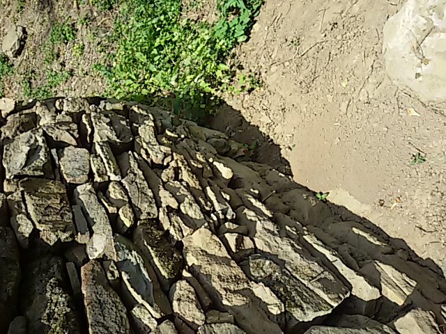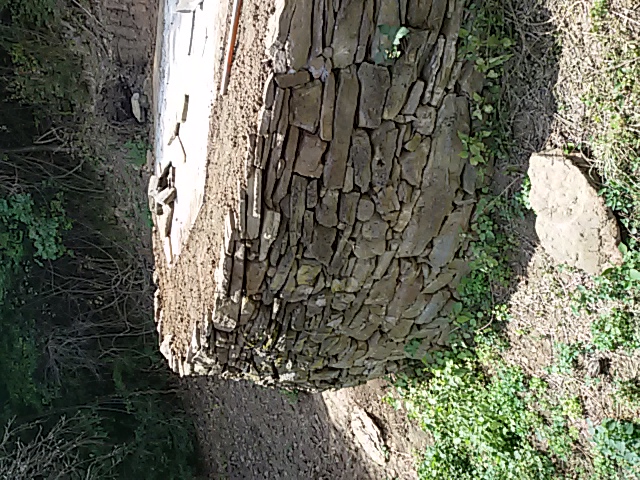 Суха зидария. Камък. Човека така е купил имота. Имота е на п.м., няма ток. Няма нещо кой знае колко важно отгоре - площадка за басейн. Към 5 кубика ще е басейна. Дайте акъл как да оправим изтумбеното!