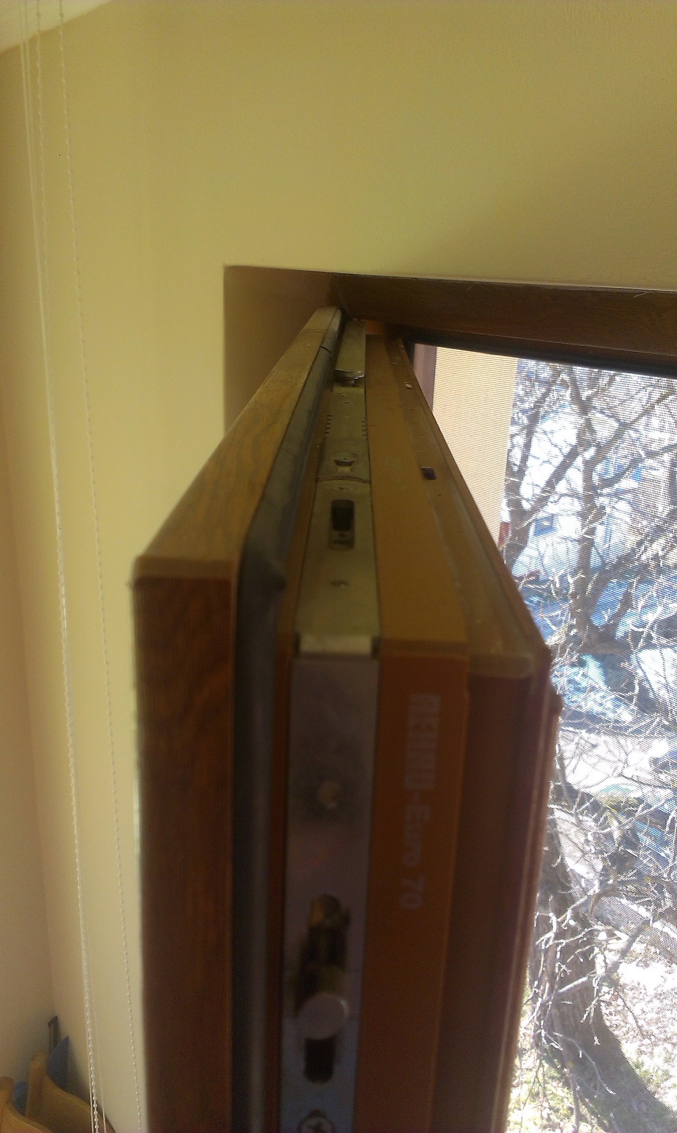 Обикновено горе на по широките ножици трябва да има също точка за заключване към касата. При теб ножицата няма заключване към касата. Даже се озадачих,и порових в един каталог. Оказва се че МАКО имат два варианта за тази ножица. И двата са кръстени "Гр.1" Само че едната е с точка за заключване, а другата - без. Първата обхваща широчини на прозорци от 635мм до 800 мм, а втората от 600мм до 800мм Това разстояние се мери не по габарита на крилото, а по канала, където лежи обкова. Ако твоето наистина е 700, като извадим два фалца по 20 мм се получава 660 мм Напълно достатъчно за да се събере ножицата с пъпка.
