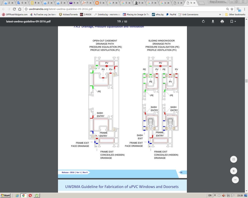 На първата картинка, която сте дали, от http://uwdmaindia.org/latest-uwdma-guid ... 9-2016.pdf на стр. 18 се вижда, какви трябва да бъдат отворите за отводнаване в долния профил и че не трябва да са един под друх образувайки пряк канал, който би влошил допълнително топлоизолацията, а и би способствал за по високо налягане около стъклопакета при насрещен вятър (и евентуално по голямо проникване на студен въздух отвън). (За съжаление съм зле с английския и ще ми е трудно да разбера написаното, затова не се и опитвах.) На стр. 19, в ляво е дадено затварящо се крило (техните – английските – прозорци и врати само на вън ли се отварят? :)), всички отвори в горния профил са вътрешни, не във външната стена на профила, и се съединяват с камерата около стъклопакета и през външния отвор на долния профил се „отварят” на вън. В дясно е дадена дограма, отваряема с плъзгане. Тя предполагам не е за отопляемо помещение, защото не може да осигури приемливо уплътнение с „четките” по периметъра на крилата. От друга страна профилите и са по „тънки” и чувствителни към деформации. Вентилирането на външните камери на профилите – чрез отвори, горе и долу - намалява температурата на външната стена на профила, намалявайки термичните деформации. Така дори се намалява топлинния поток предаван от нагрятата външна повърхност на профила през лятото. (Май съвсем не е еднозначно, съжалявам, че се правих на умен :))