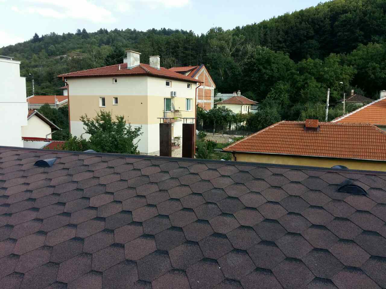Под битумните керемиди има воалит ,под него кофражни плоскости доста здрави .Ватата е сложена не много плътно между гредите защото е 5см , имах чуството че ще падне за това ги накарах да сложат по средата тънки метални пластини хванати за гредите за да не може да падне ватата ! Под ватата е сложена мушама паропропусклива закована за гредите но не много добре на места висеше ! Под мушамата оставиха 5 см разтояние уж за циркулация на въздуха хаха ,след което нова вата 5 см сложена върху гипсокартона ! Около отворите -одушниците на покрива изрязаха дупки на първата вата между гредите за да влиз въздух ! Качвам снимки на гредите и покрива за да видите одушниците !