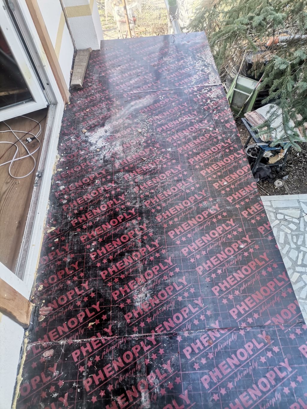 Направих балконче към пристройката. Още като я правихме (с греди и плоскости) оставихме да стърчат навън дървените греди от конструкцията, през 40 см. и сега направих балкон, като наковах плоскости за кофражни платна върху тях. Отдолу го затворих с пластмасова ламперия (вижда се на снимката). Знам, че тези платна не са най-добрият избор, но всичко го правихме с много тънък бюджет, с помощта на приятели и материали събрани оттук-оттам - подарена дограма и ламперия, стари улуци и прочие. Но пък това стимулира иновативност, вижте как съм прихванал улуците