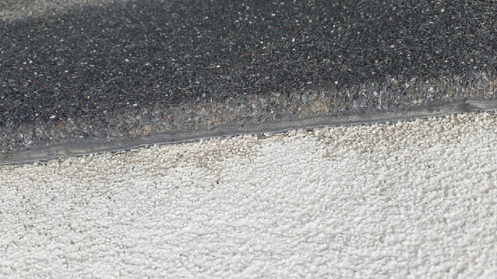 казуса е следния - открита тераса, която в един момент е протекла и предния собственик е заслал с воалит с посипка. Проблема идва при цокъла - на контакта на воалита и минералната мазилка е сложен с пистолет битумен уплътнител и няколко години е било ОК ама явно двата материала са много контрастни по термични свойства и този уплътнител полека отпаря минералната мазилка. На местото започва да се събира прах, като вали вода, тук таме и мъхчета тръгнали:
