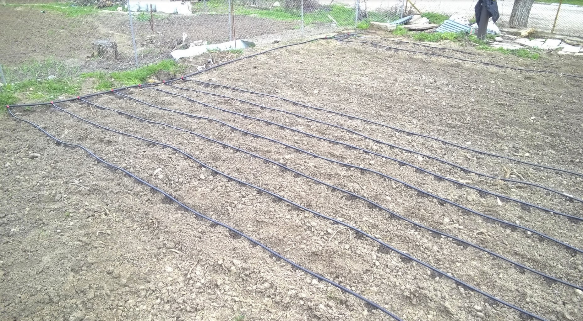 Започнах с напояването на бъдещата градина, защото още нямаше нужда на дръвчетата, а и голямата хамалогия с около 300 метра тръби не беше минала :)