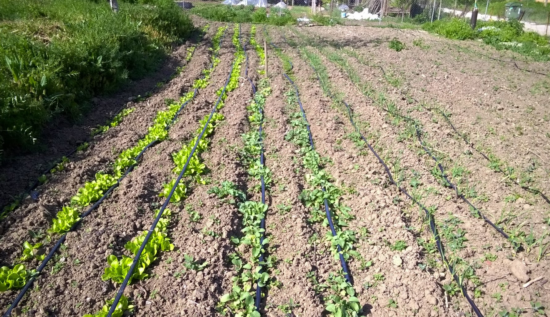 След като засях няколко реда салатки, моркови, репички, лук, и чесън .. положих и тръбите за дръвчетата ...