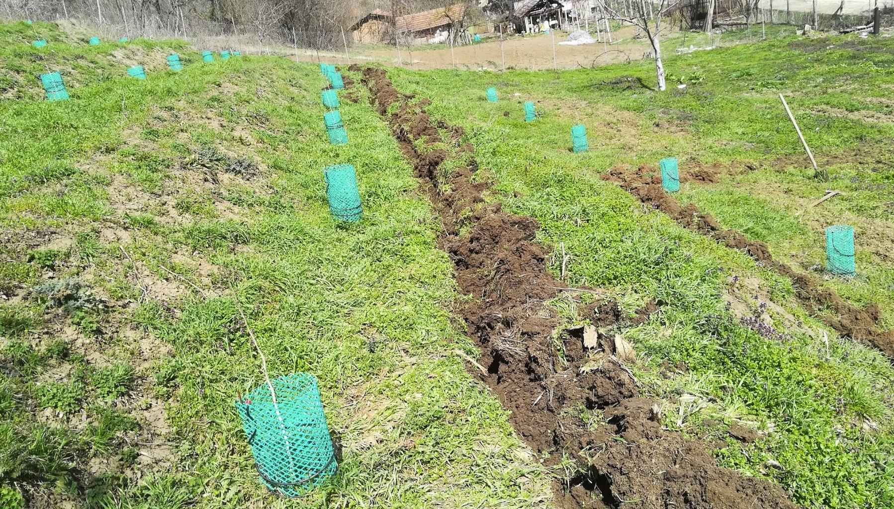 В тези канали не особено дълбоки положих тръбите и от там разклонение до всяко дръвче отново под земята.. като само разпръсквача излиза до дървото и полива.