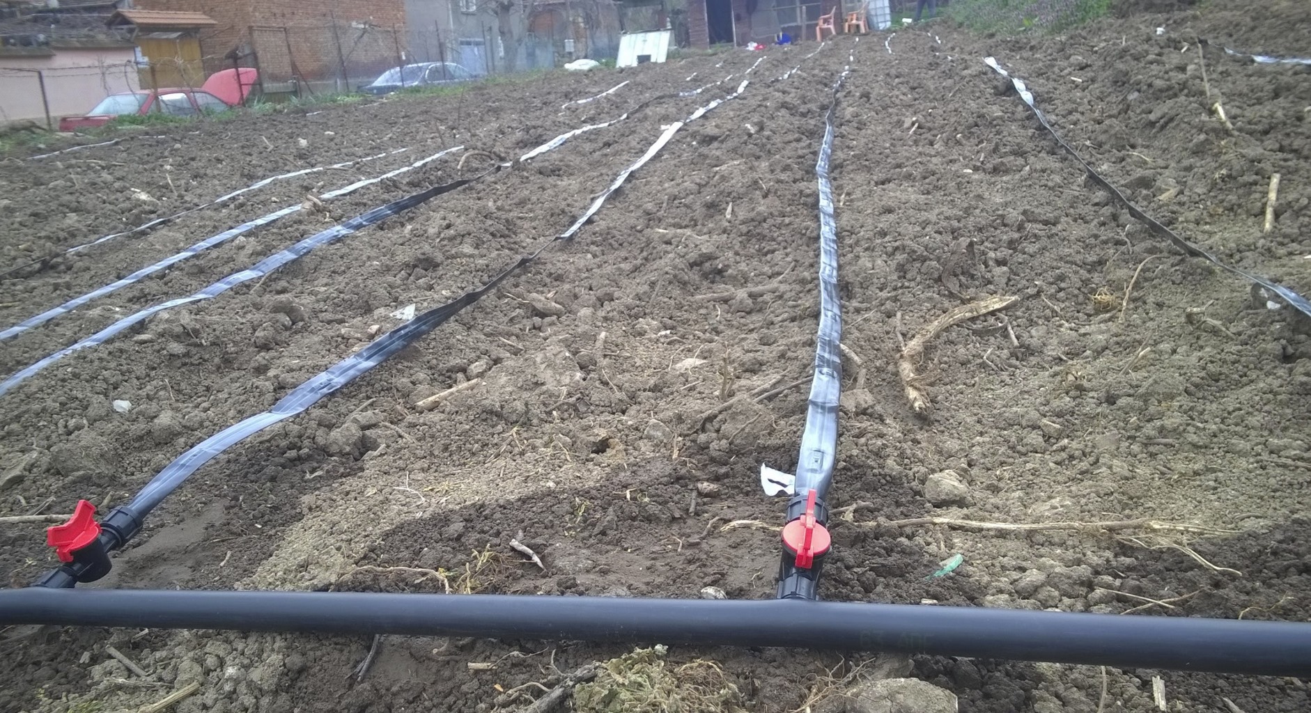 След като засях няколко реда салатки, моркови, репички, лук, и чесън .. положих и тръбите за дръвчетата ...