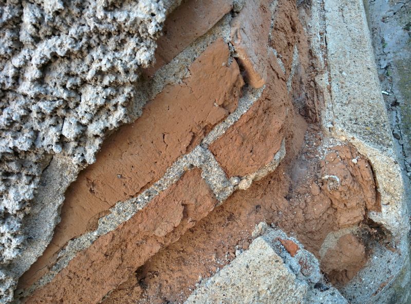 На въпросната стена, основата от камък е само 10-12 см над нивото на бетоновата пътека. Нагоре цокъла (около 60 см), както и стената са изградени от еденични тулхли. Цокъла е издаден с около 5 см пред равнината на стената. Мазилката е пръскана с цимент, без грундиране, преди около 35 години. Мазилката над цокъла е паднала и частично тухлите са обрушени на и до 20 см над нивото на уширението, предполагам от обмокрянето през годините.