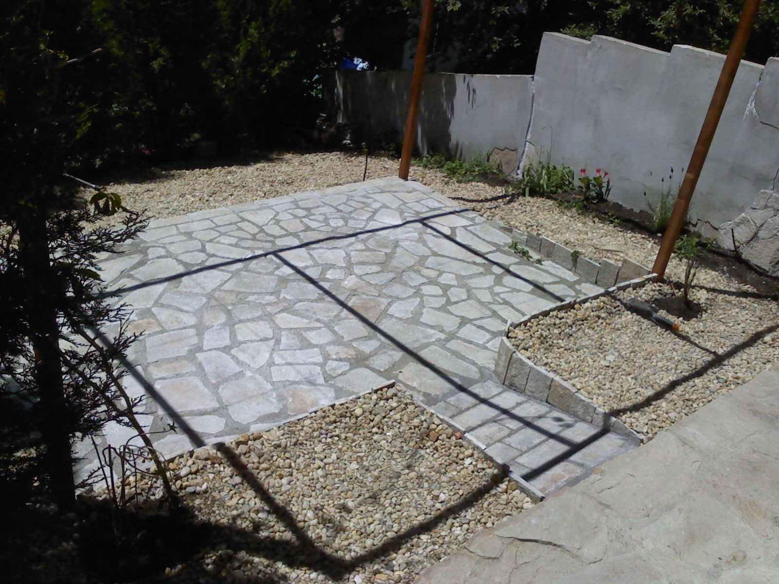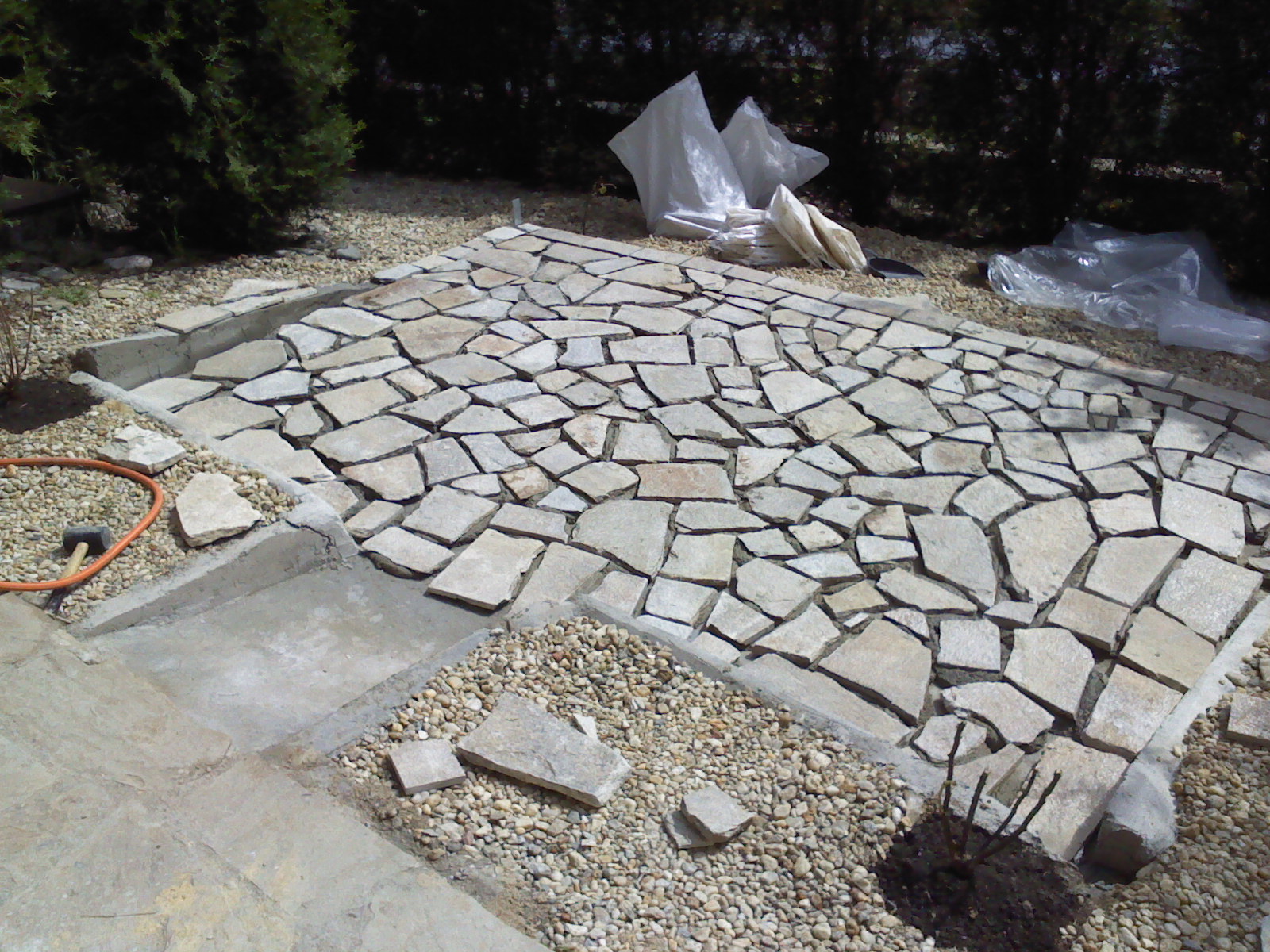 За настилката виках един приятел, който разбира от редене на камъни. Аз ги носих, бърках му разтвора, въобще - помагах му и гледах да открадна занаята. Ето ги наредени без фугата: