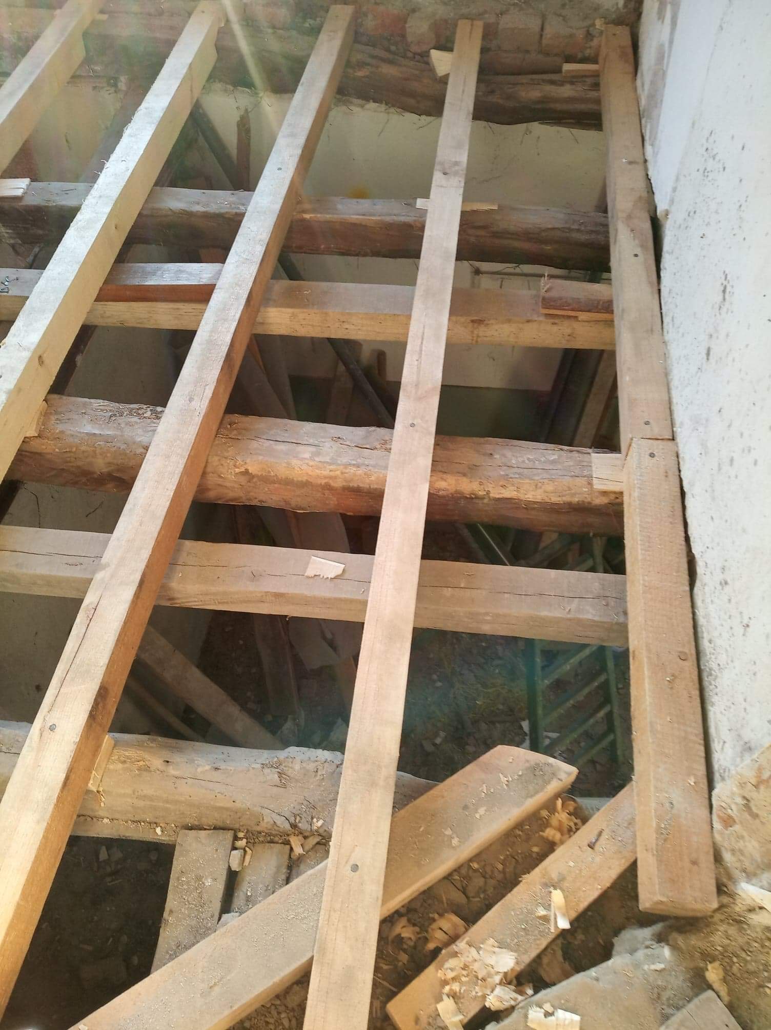 Ремонтът продължава. Вече са сложени греди между двата етажа - в едната стая 10х8, в другата 8х6. Така изравнихме нивата на двете стаи. Гредите са през около 40 см, така че един лист OSB стъпва върху четири греди. Върху гредите наредихме два слоя OSB с дебелина 15 мм. Стана стабилно. Голяма играчка беше нивелирането, понеже старите носещи греди бяха доста криви - на места подлагахме доста, на места зарязвахме.
