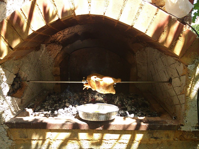 Моторче за монтаж в кухненска печка на цена от 10лв, има и за микровълнова малко са по-мощни, но са по скъпи, около 30лв., пръчка с диаметър ф10, неръждъвейка и от един сайт си поръчах вилици за шиш, цена 6лв и за двете. Пробих по една дупка от двете страни на стените, сложих в тях по едно парче тръба 3/4 за да не се руши тухлата и другото мисля че е ясно. АААА на пръчката се наложи да направя на фреза квадрат, тъй като накрайника на моторчето е квадратна втулка 6х6.