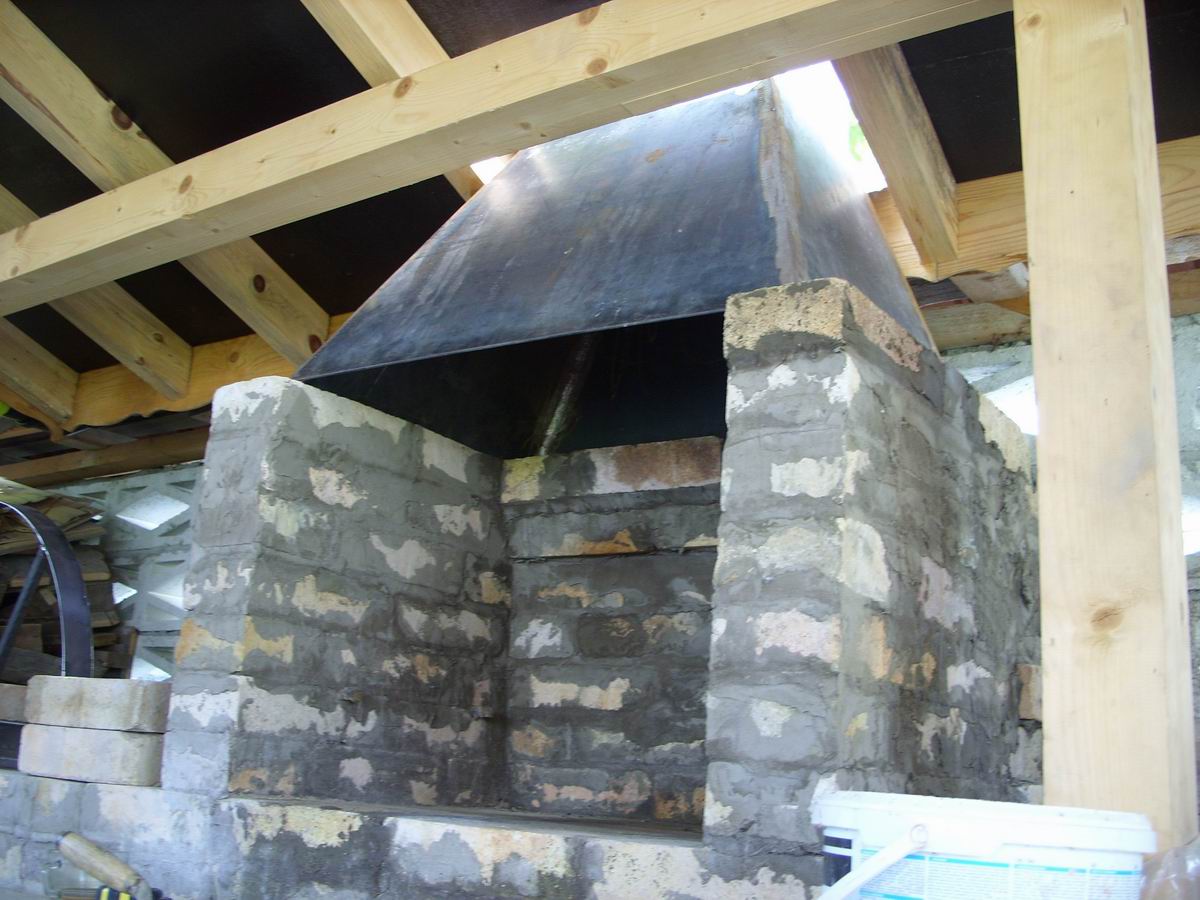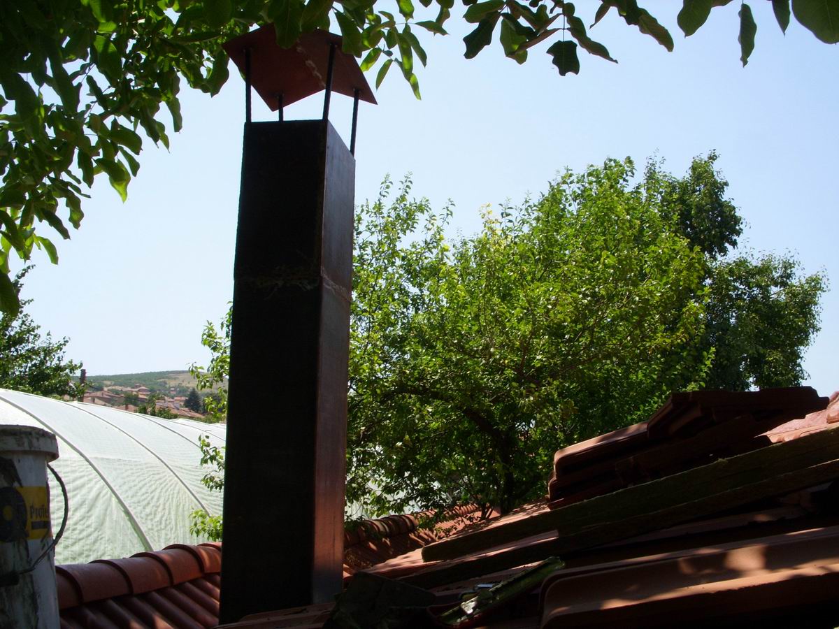 Комина е със сечение 35/25см, вестника показа че дърпа добре. Висок е 1.5м., 80см е над билото на навеса.Също ще го изолирам с 2см кам.вата. Булото и комина впоследствие ще се облицоват с камък. Както и самото барбекю.