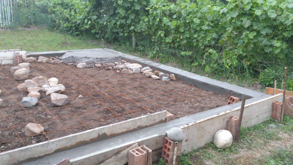 В момента съм излял ивични основи с дълбочина около 40см, широки около 30. Използвани са речни камъни, а частта, която е над земята е с бигли, арматура и по-ситни камъни и бетон разбира се. Остава да се отлее плочата и от тук идват въпросите ми.