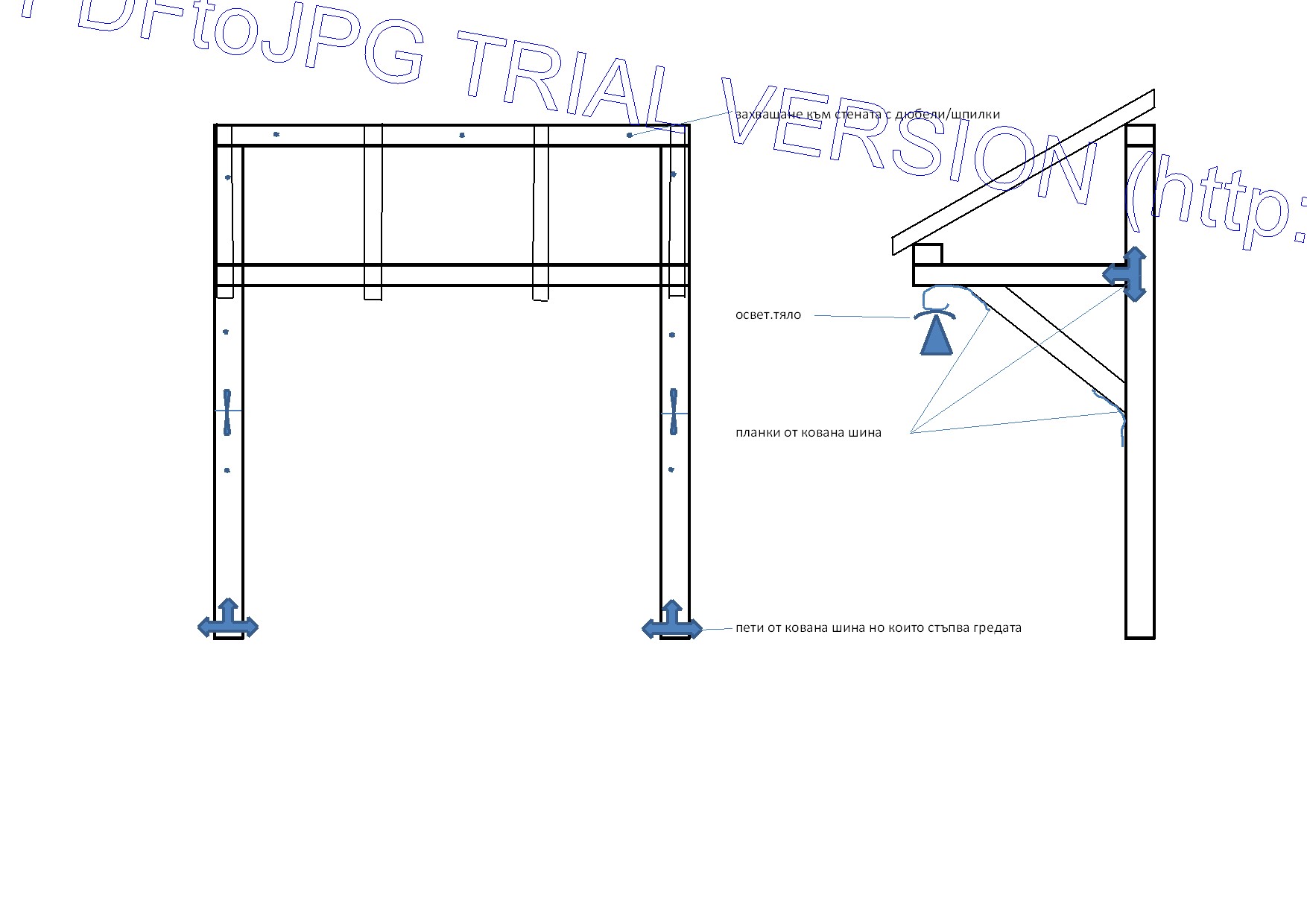 прилагам скицата, по която аз си правя козирката на входната врата. Основните греди са квадрат със страна 8 см., а тези на които ще се кове ламперията са квадрат със страна 6 см. Напречните и подпорните греди са захванати с винтове за дърво 12 см. и подсилени с планки от кована шина 3 см. Вертикалните греди стъпват на квадратни пети от кована шина. Снимми на елементите ще мога да приложа около 24.05., тъй като чак тогава ще пътувам до вилата.
