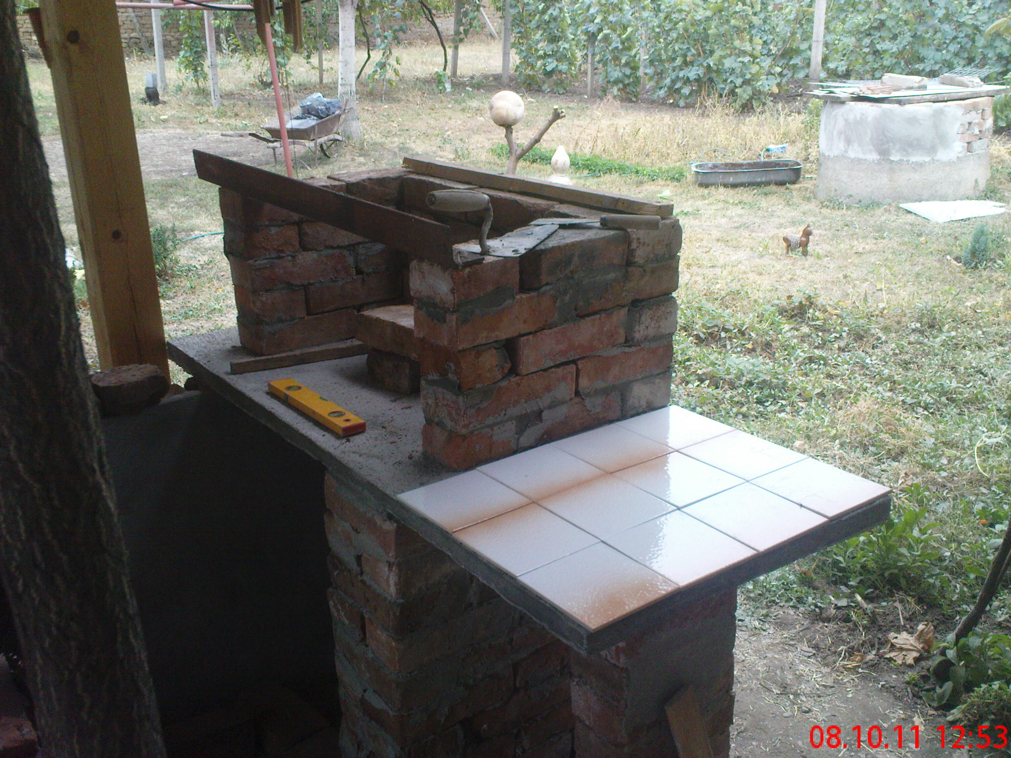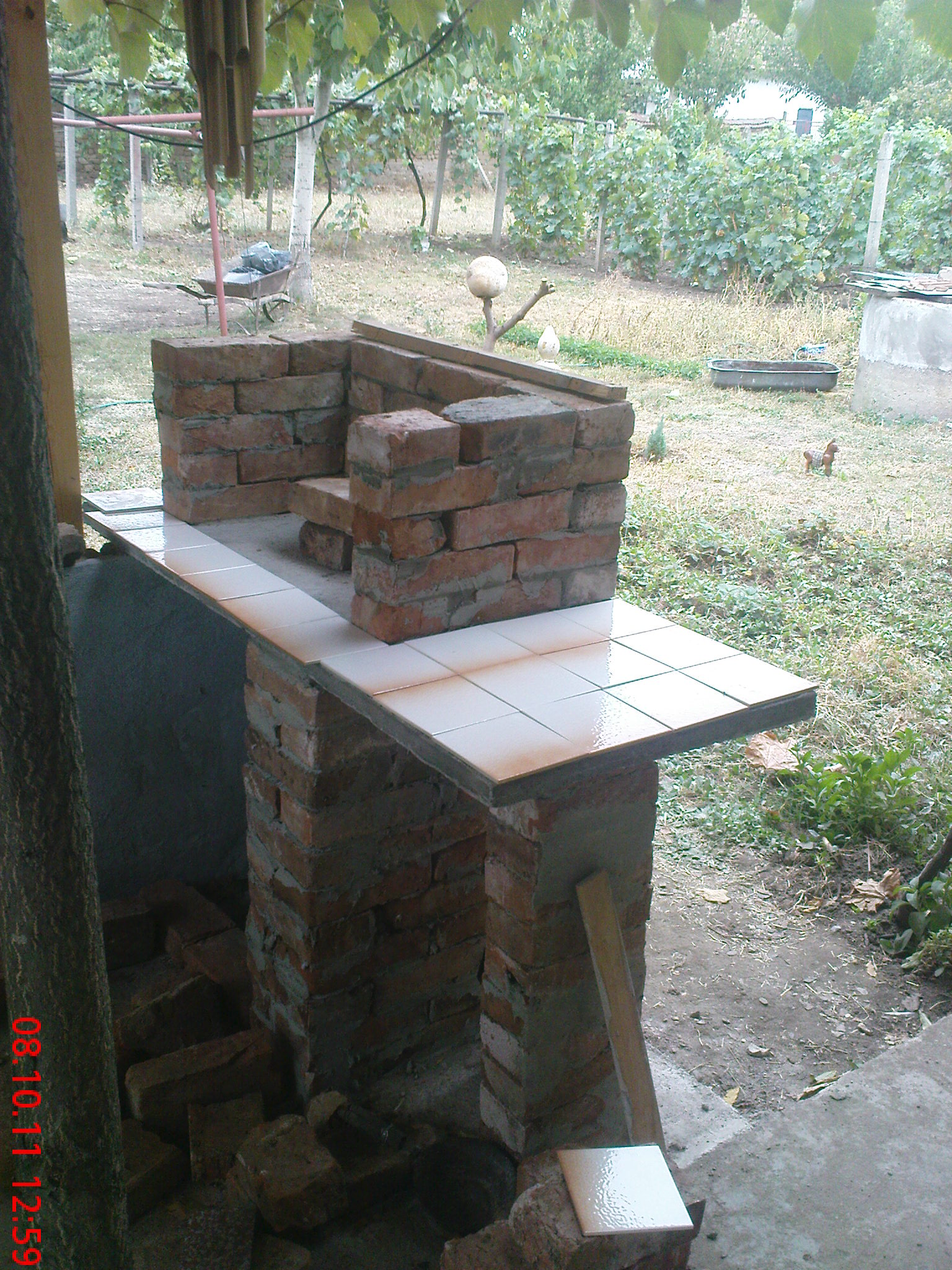 Имам на село в двора един навес от около 16-18кв.м и под него имах свободно пространство от 1,5кв.м. и рекох,че тук ще е моето барбекю. Навързах арматура Ф8 и отлях плоча с размер 1.10 на 1,40см. Стегна се бетона и започнах със стари еденични тухли. Първо наредих няколко реда тухли, без да ги лепя за да видя и измисля разни варианти. Спрях се на един и започнах да зидам.Използвах лепило за плочка върху плочка тип Ц1. и като за начало се получи това: Иззидах и една подпора за да легне на нея единия край на плочата която отлях на цимент и я вдигнах след това.,. В самата плоча има арматура Ф4. След това наредих пак тухли за да видя как ще изглежда.Хареса ми и продължих.А котката явно усещаше какво ще се пече вътре и немърдаше от мен.